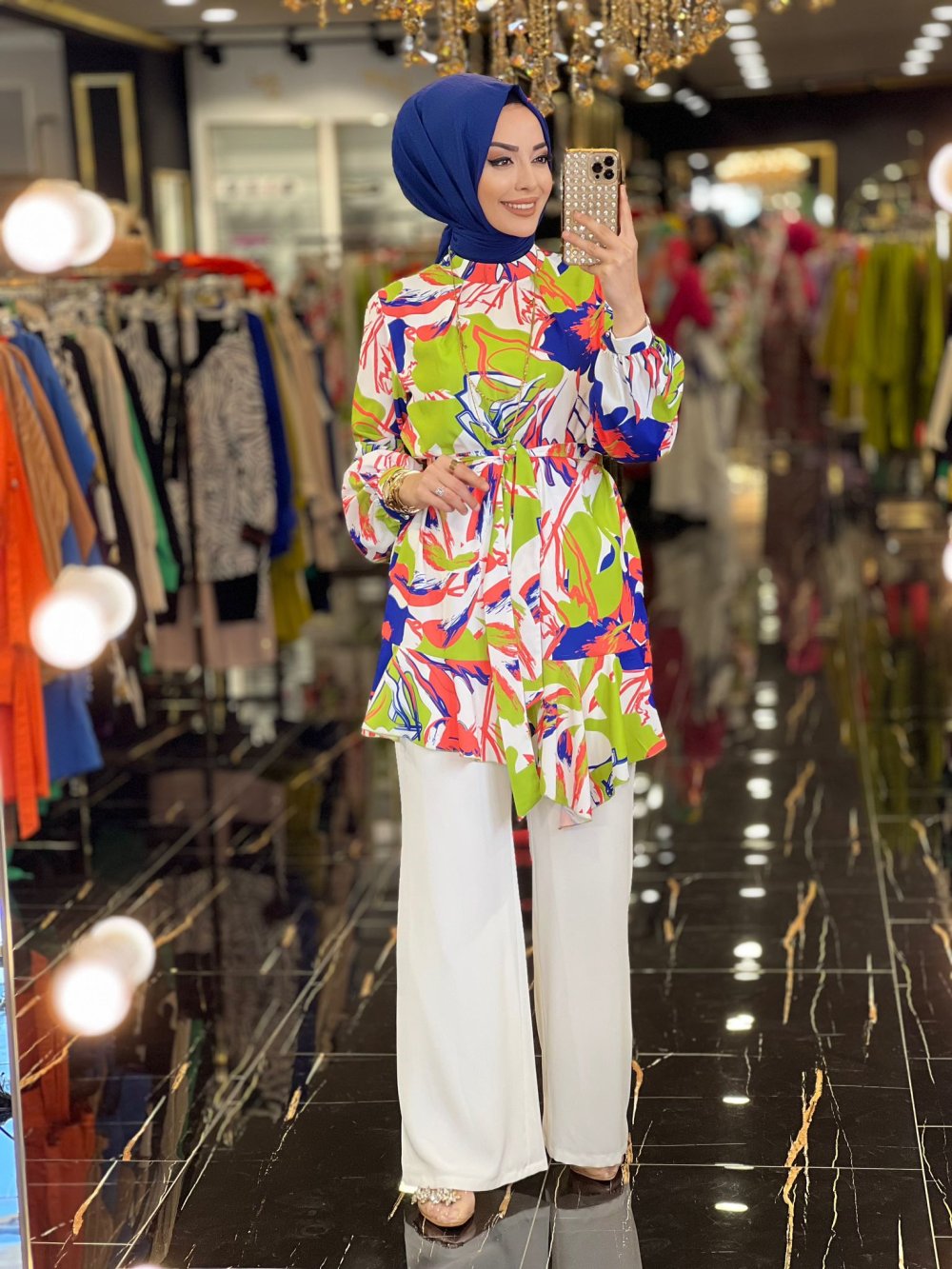 02-1822 Üst Desenli Bluz Pantolon Takım Oranj Ekru