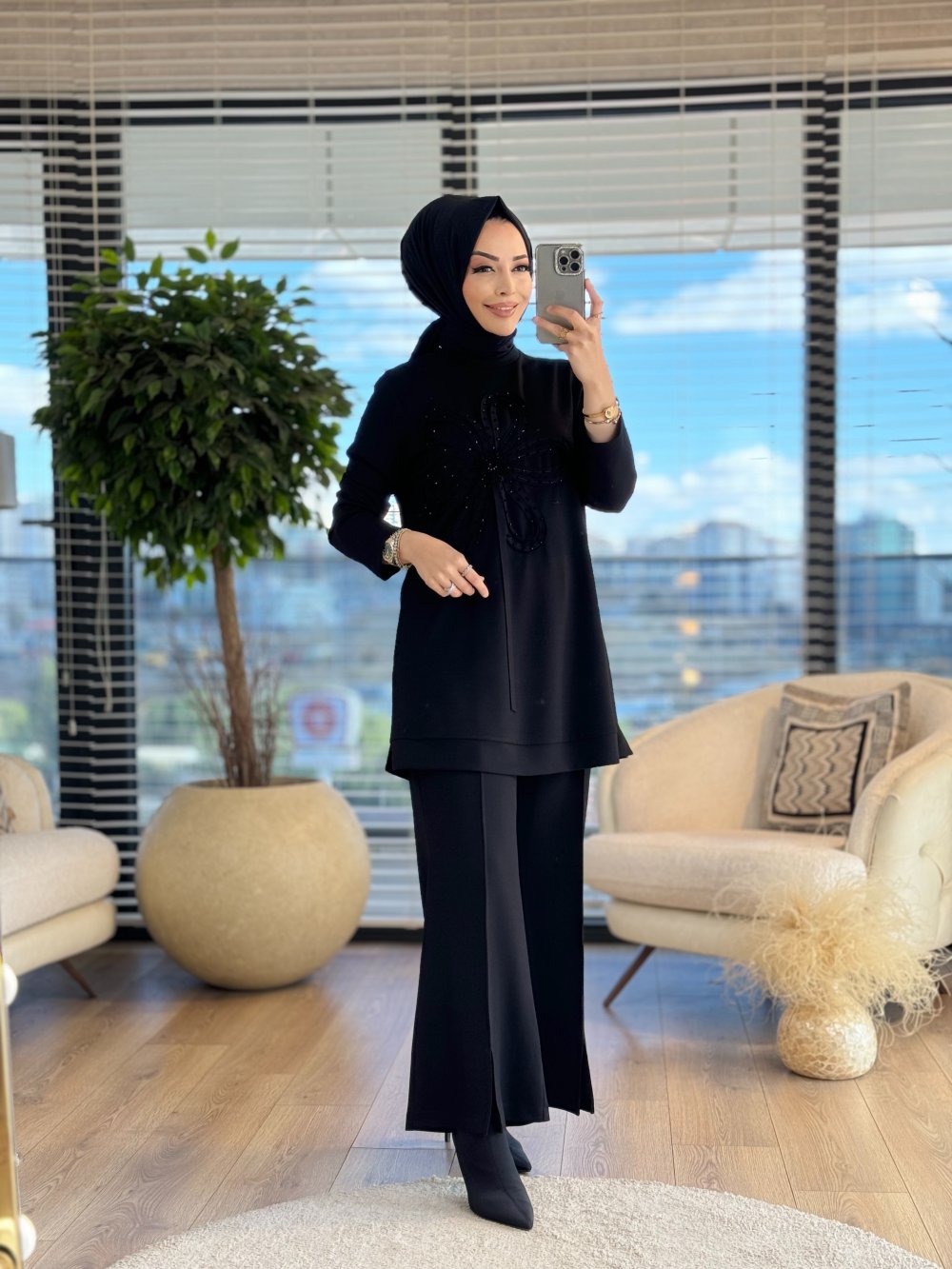 02-2198 Ön Büyük Çiçek Nakışlı Takım Siyah
