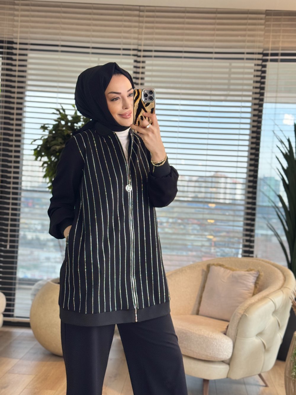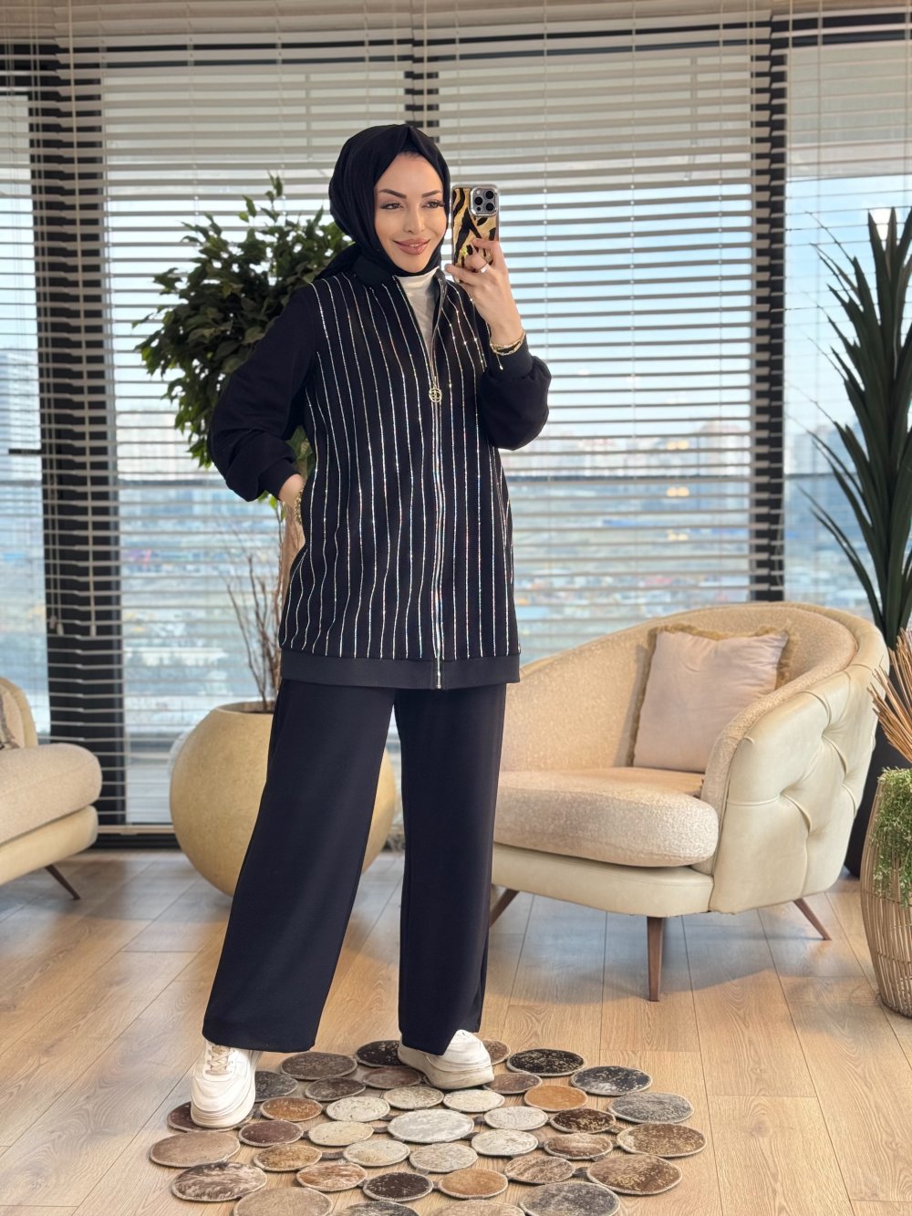 02-2726 Ön Boyuna Taş Baskılı Takım Siyah