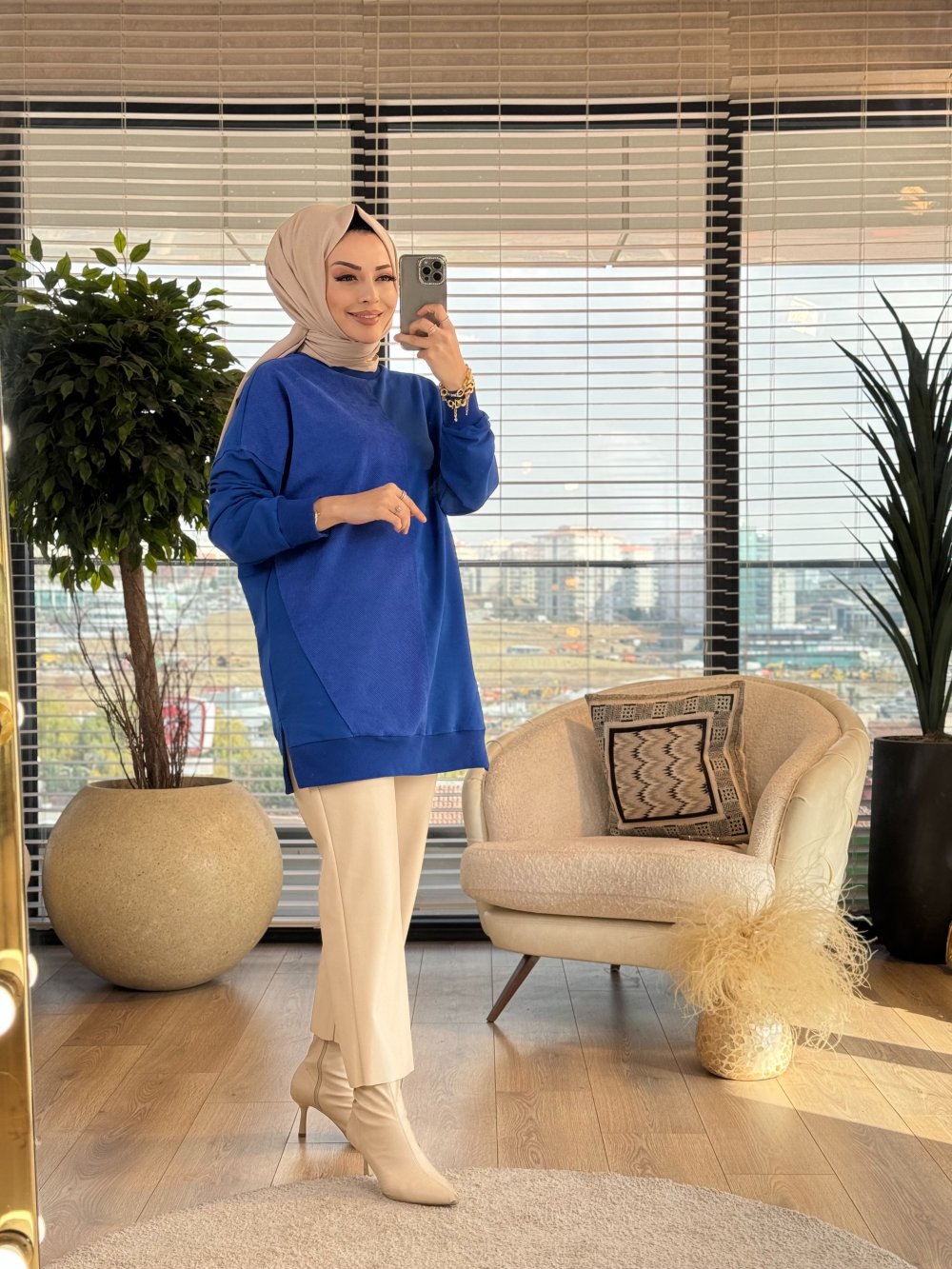 10569 Sol Taraf Fitilli Kadife Parçalı Tunik Saks