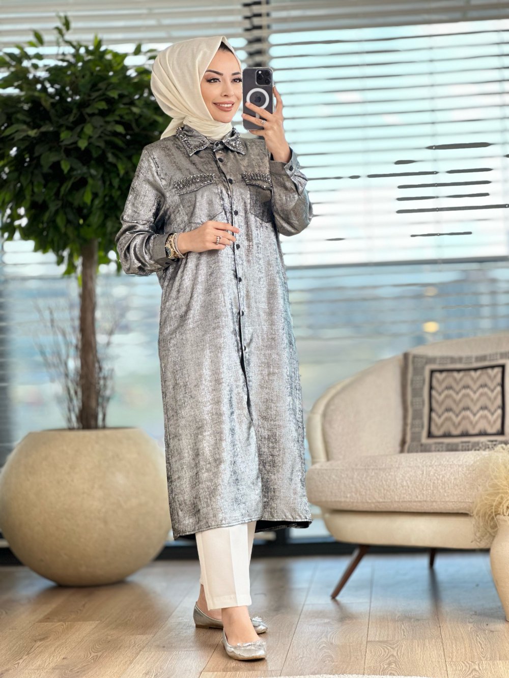 1058 Yaldızlı Taş Detaylı Tunik Gümüş