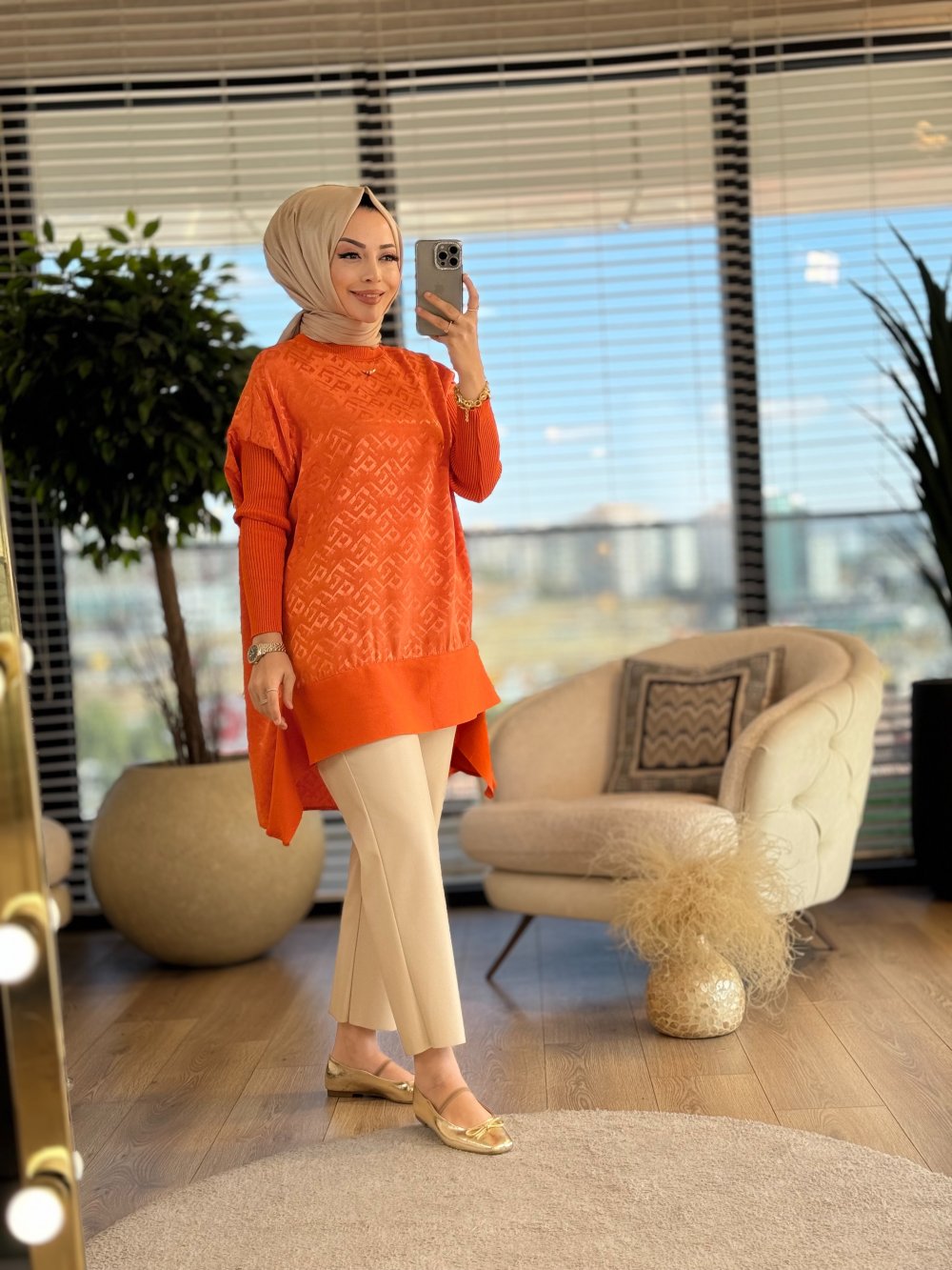 10580 Kendinden Geometrik Desenli Tunik Oranj
