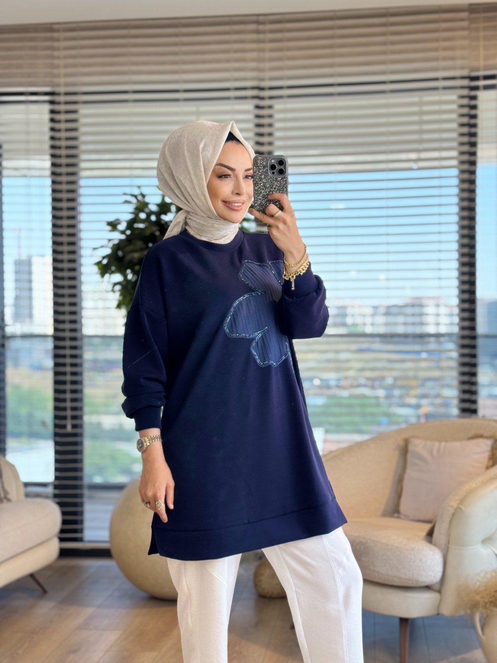 10627 Sağ Göğüs Çiçek İşli Tunik Lacivert