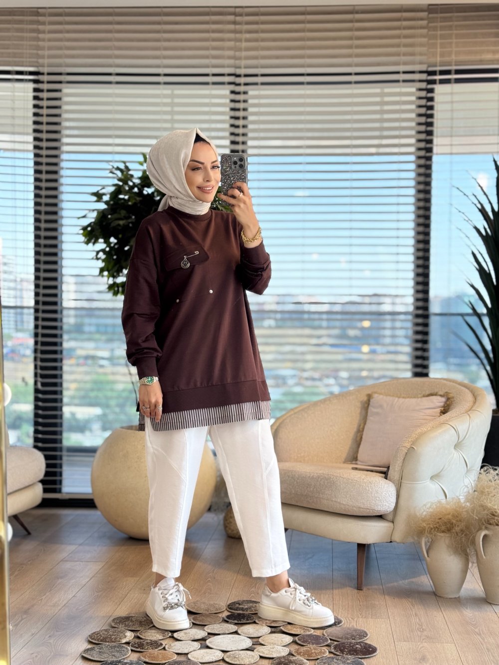 10720 Etek Ucu Çizgi Parçalı Tunik Kahve