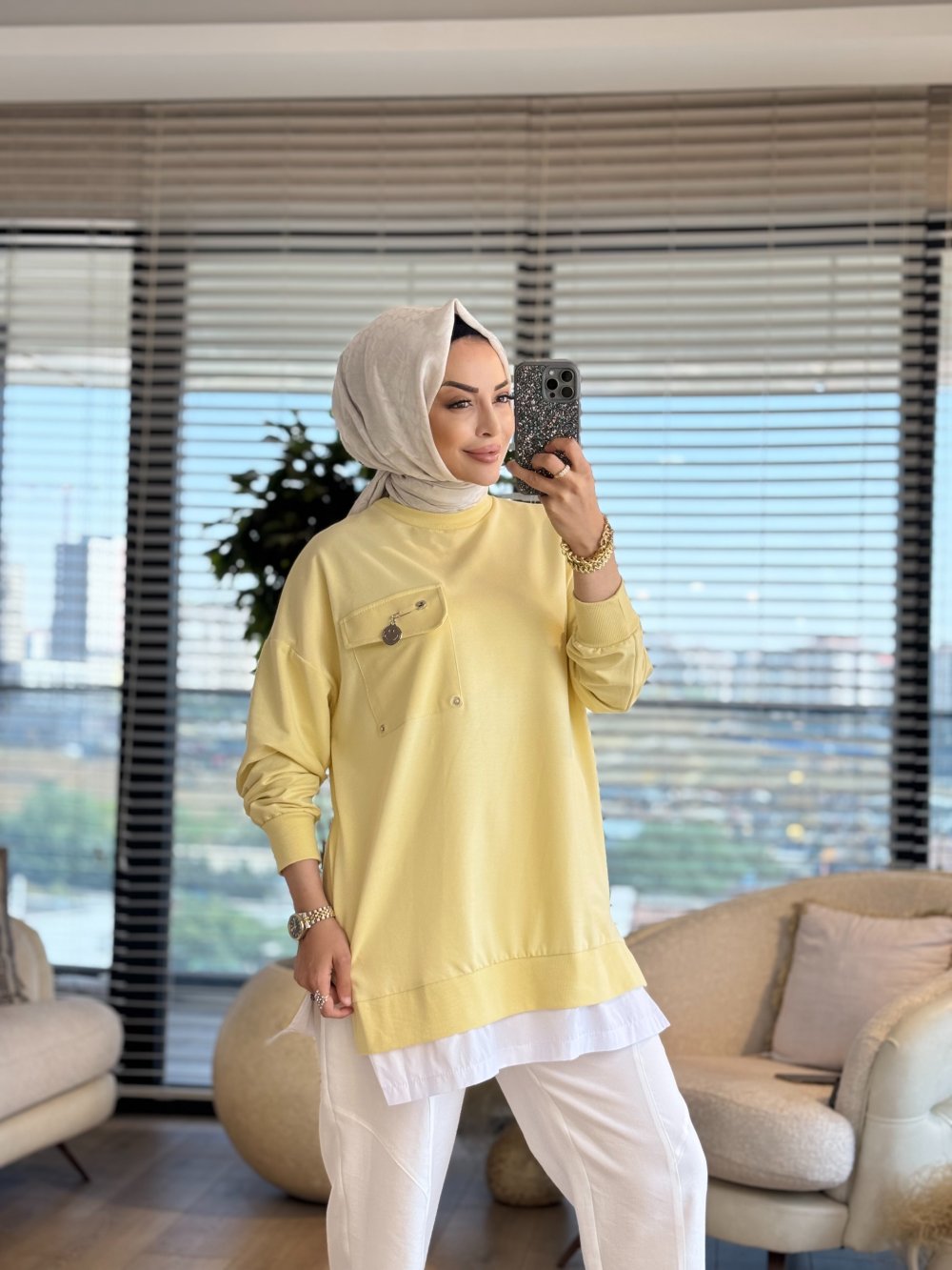 10720 Etek Ucu Çizgi Parçalı Tunik Sarı