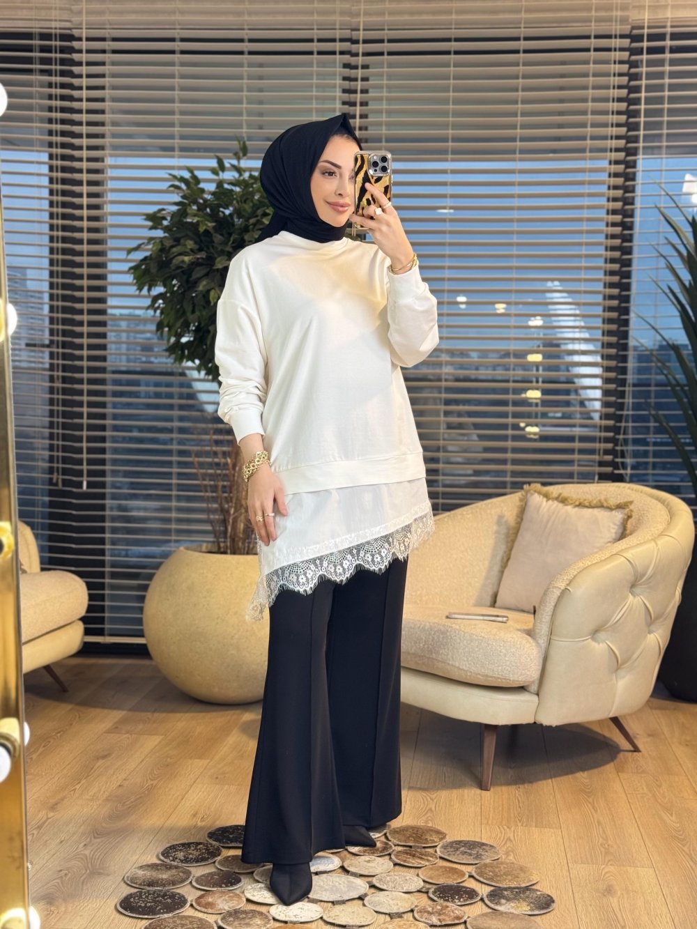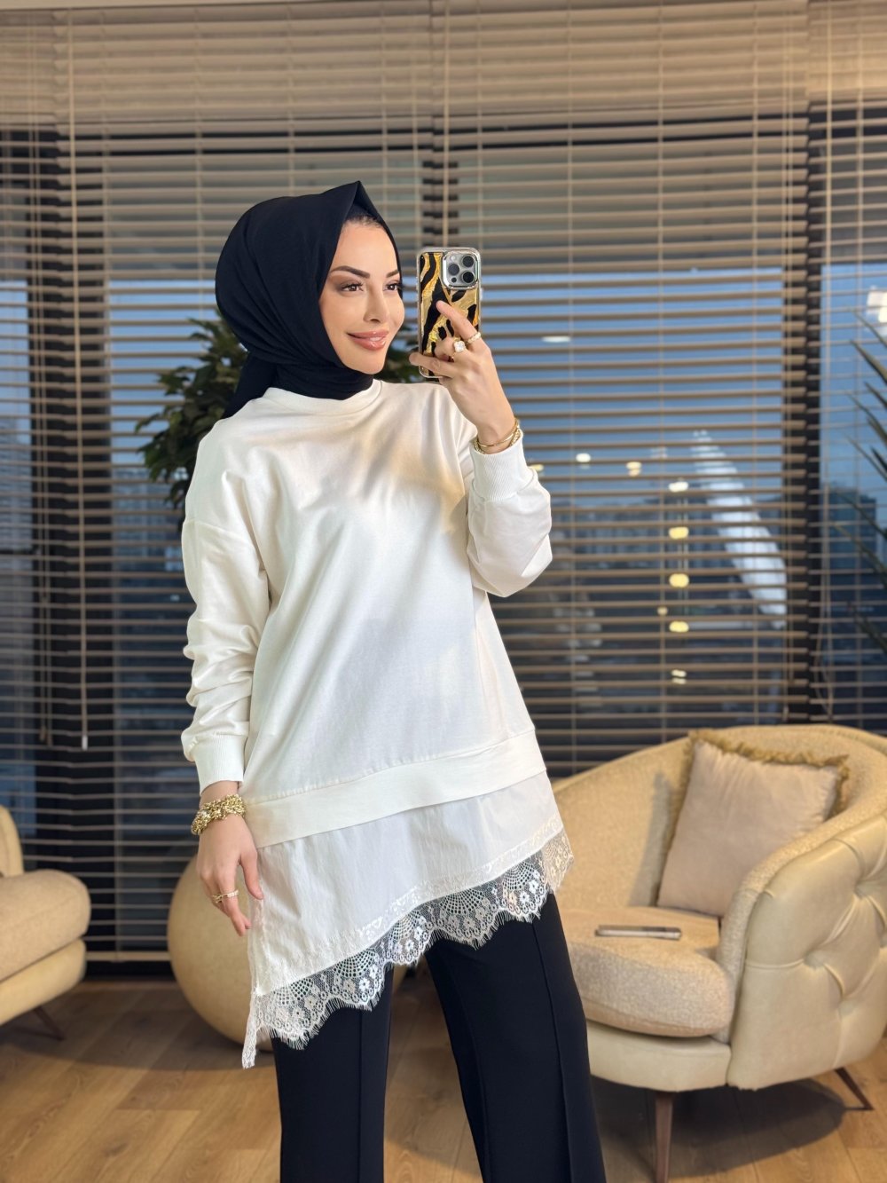 10766 Etek Ucu Dantelli Tunik Ekru
