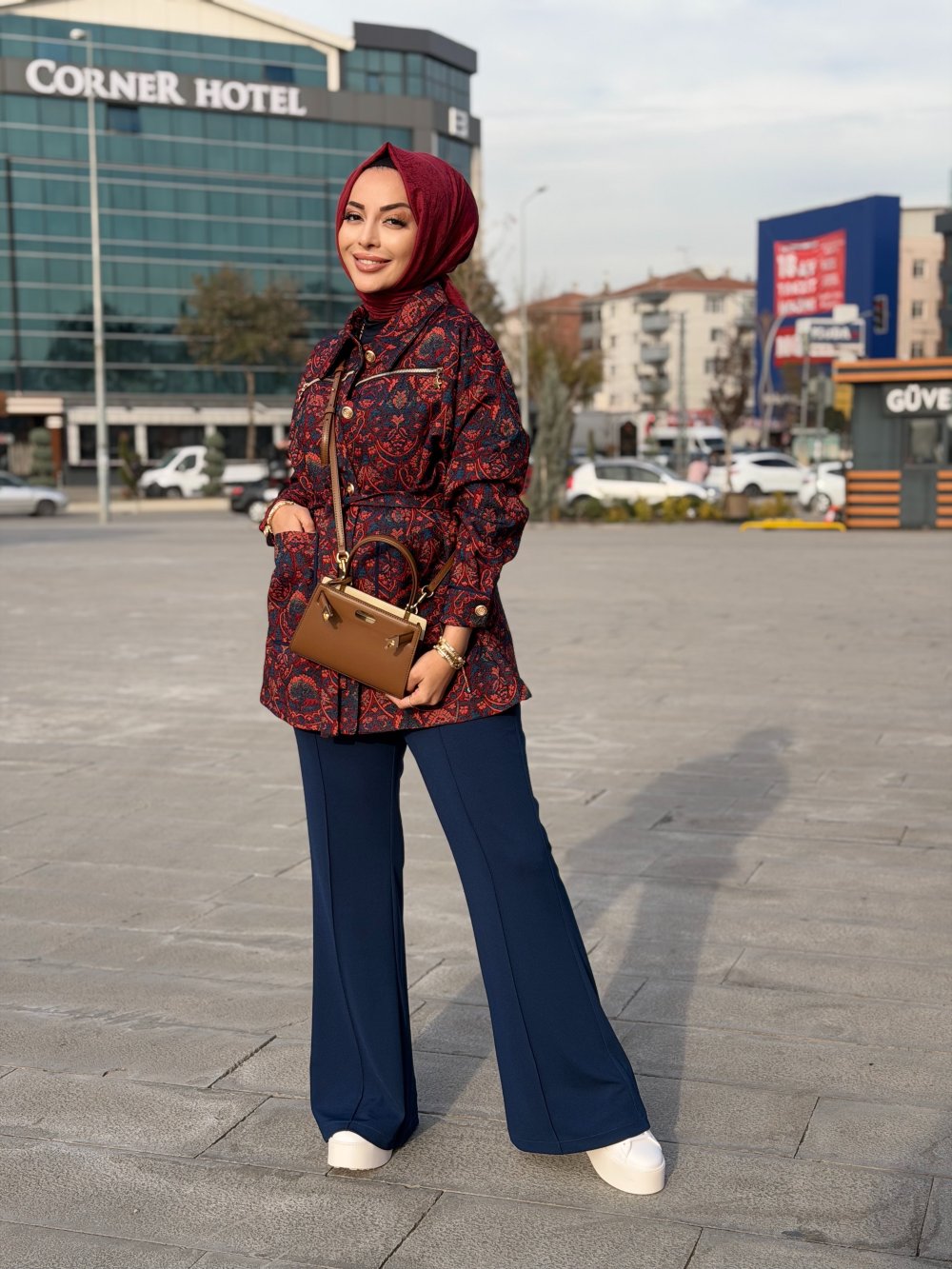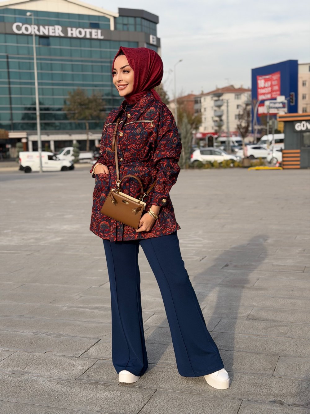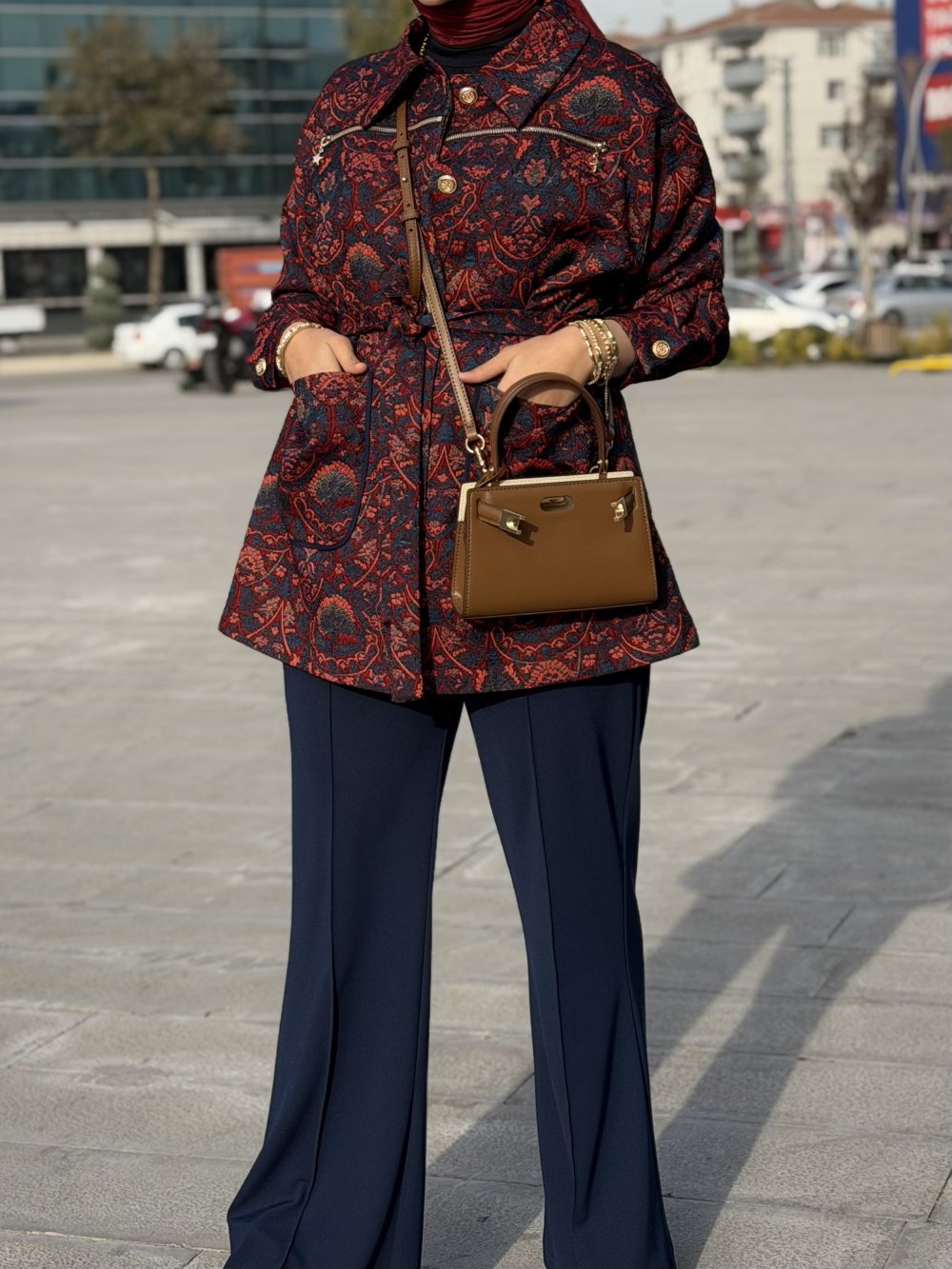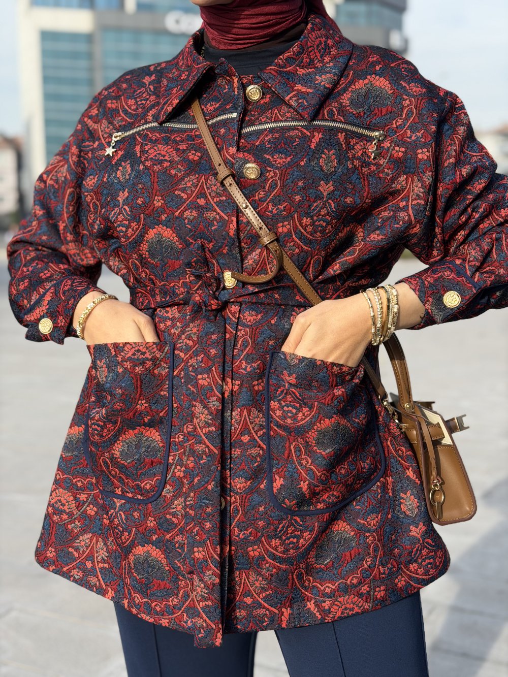 10835 Kendinden Çiçek Desenli Ceket Bordo