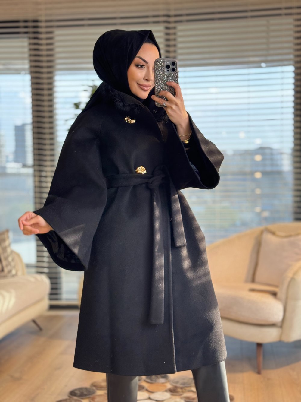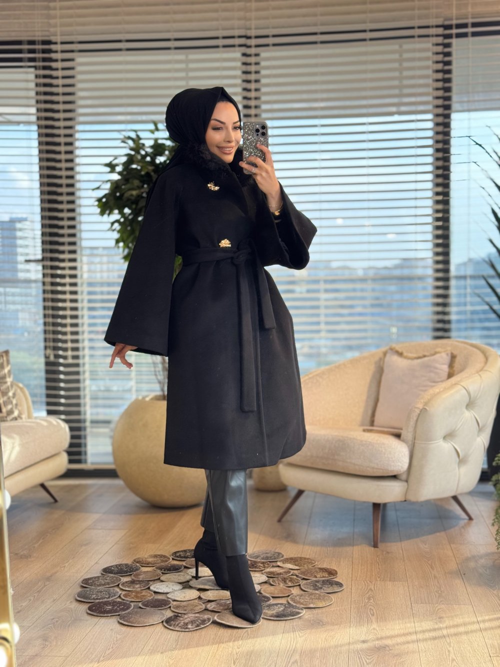 10873 Yakası Kürklü Kaşe Kaban Siyah