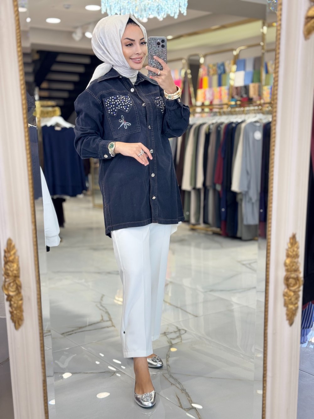 112730 Cebi Taş Detaylı Kot Gömlek Siyah