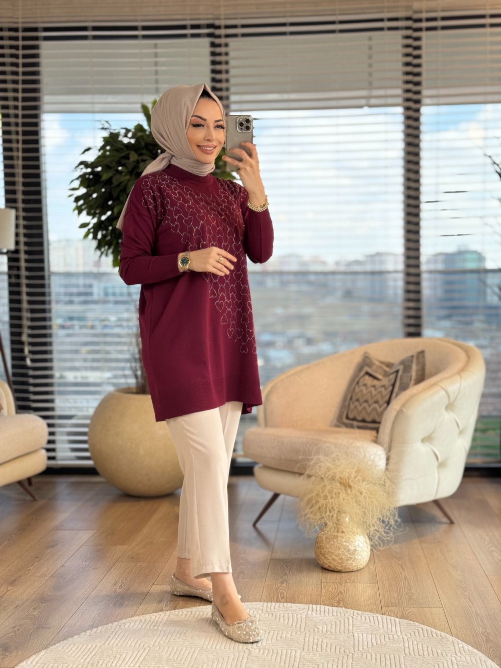 140315 Kalp Desen Taşlı Triko Tunik Bordo