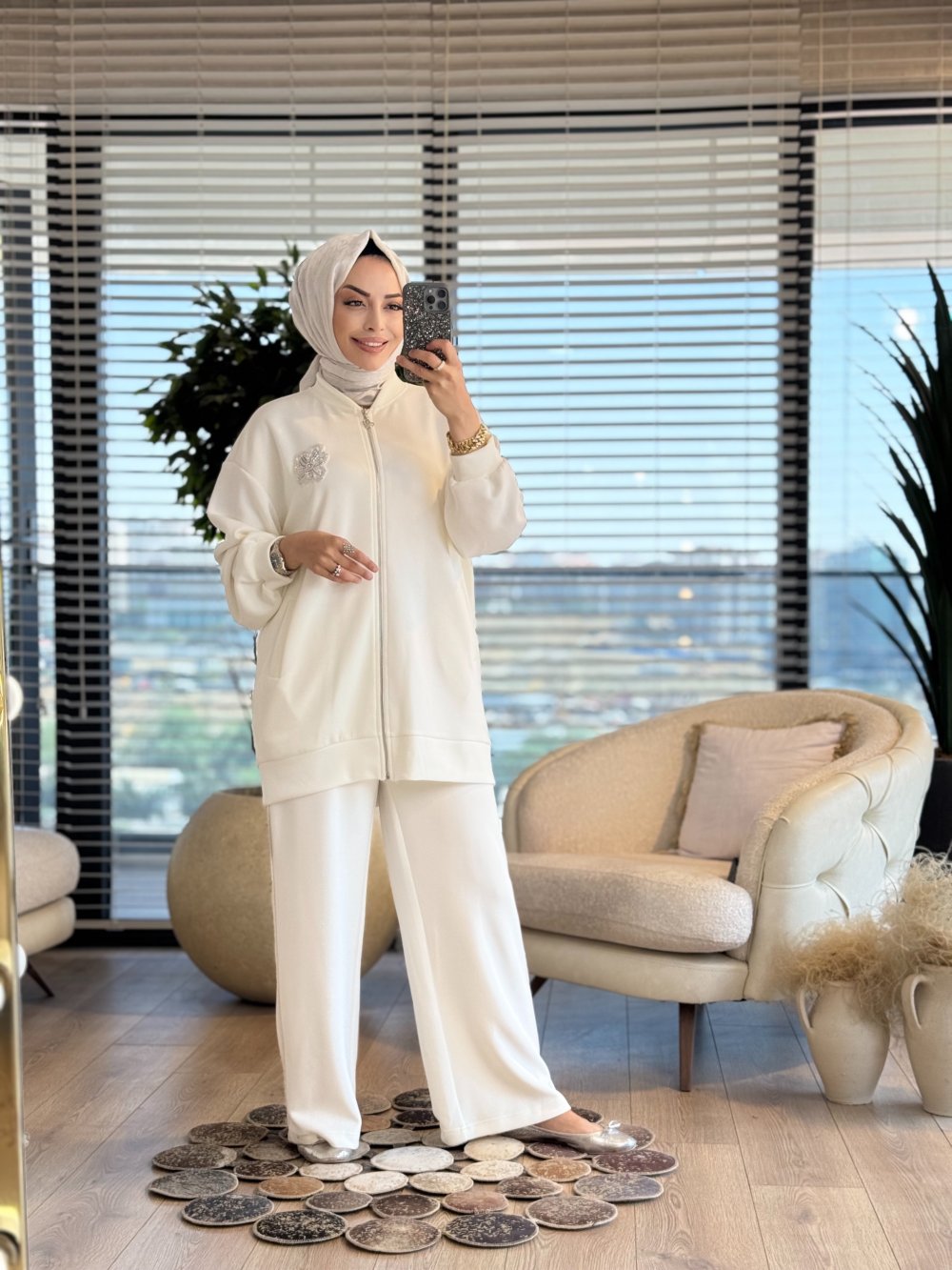 14305 Çiçek Broşlu Fermuarlı Takım Ekru