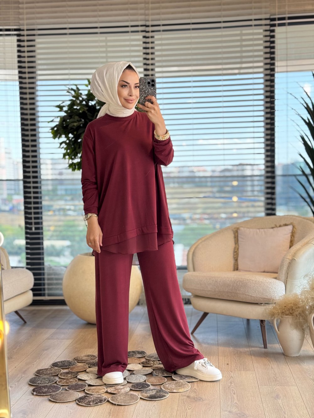 14352 Etek Ucu Şifonlu Takım Bordo
