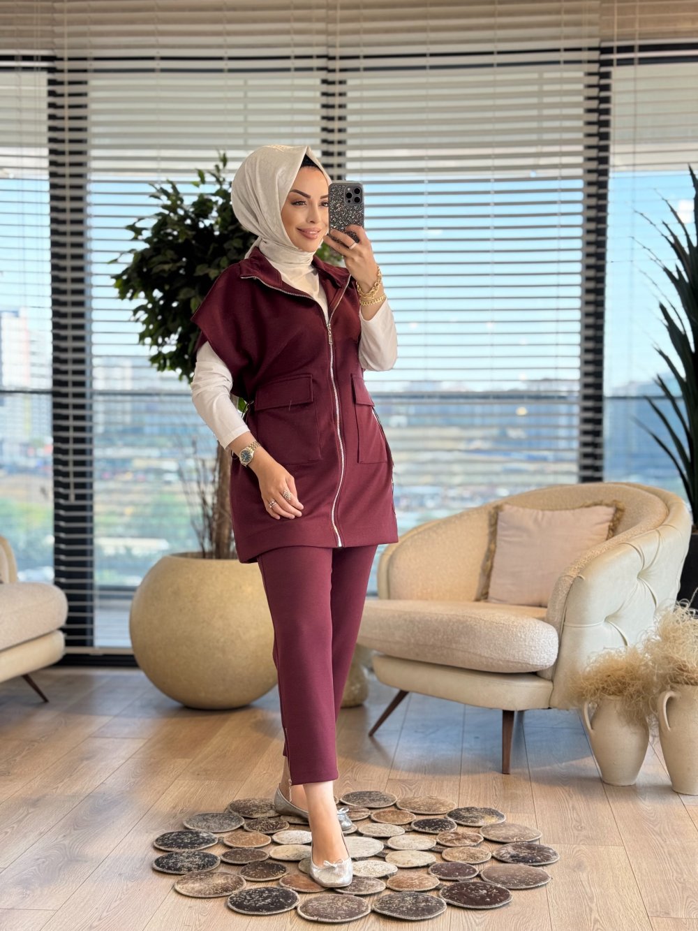 14382 Üst Yelekli Önü Cepli Takım Bordo