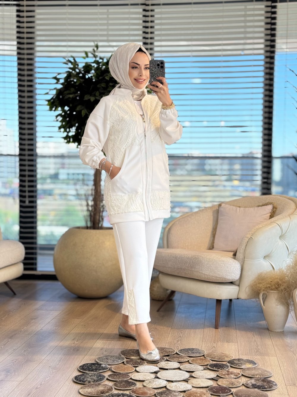 14387 Önü Sutaşı İşlemeli Takım Ekru