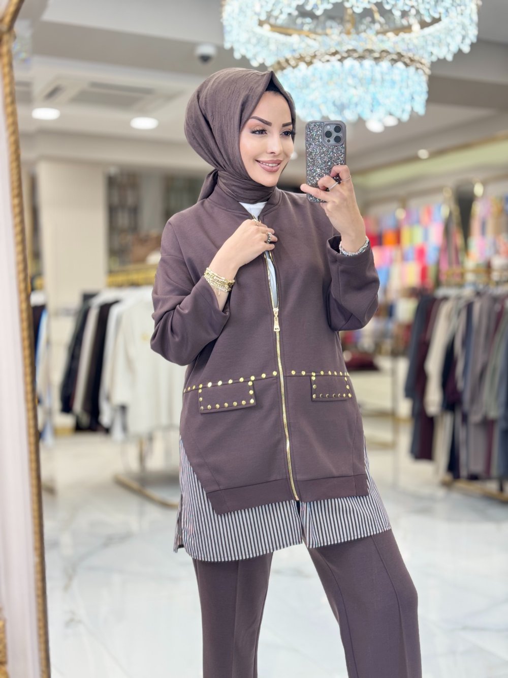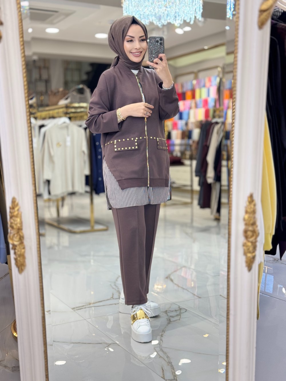14410 Etek Ucu Çizgi Parçalı Takım Kahve