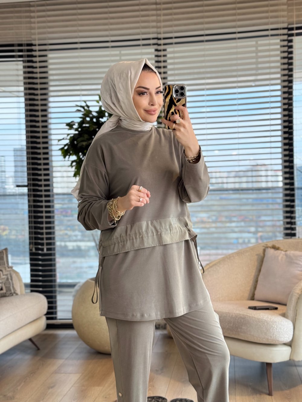 14456 Önü Saten Şerit Detaylı Takım Haki