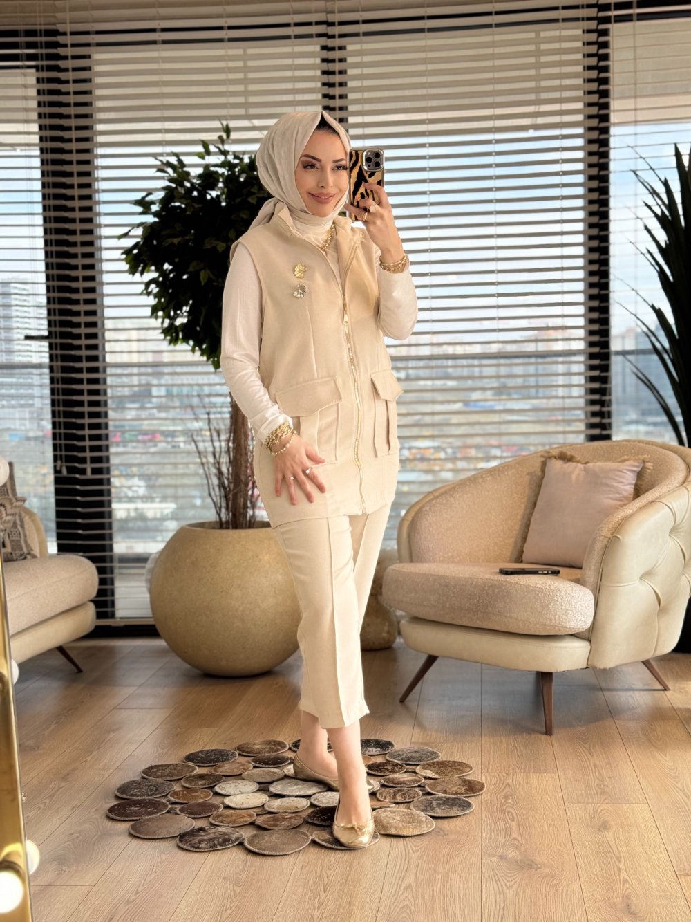 14463 Önü Cepli Ferm. Yelekli Takım Bej