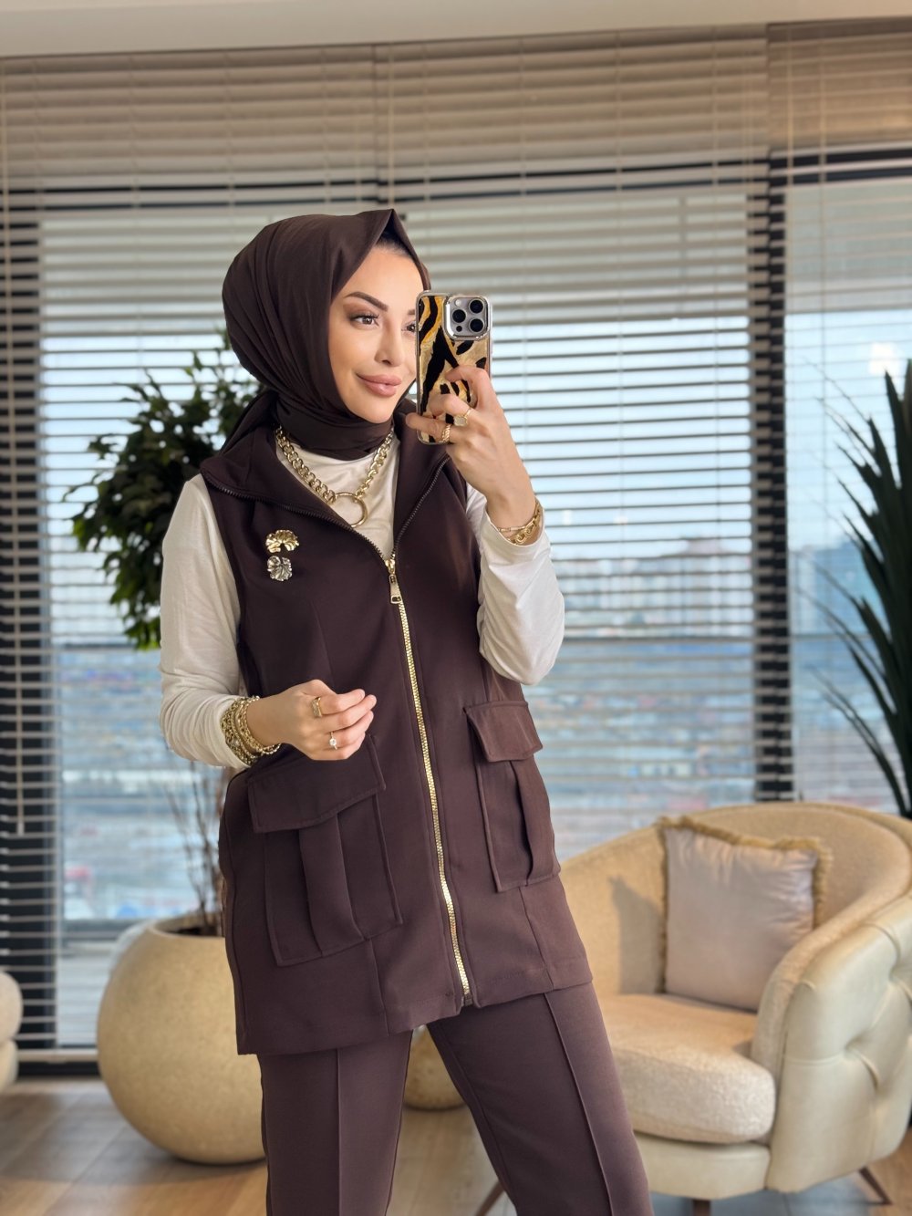 14463 Önü Cepli Ferm. Yelekli Takım Kahve