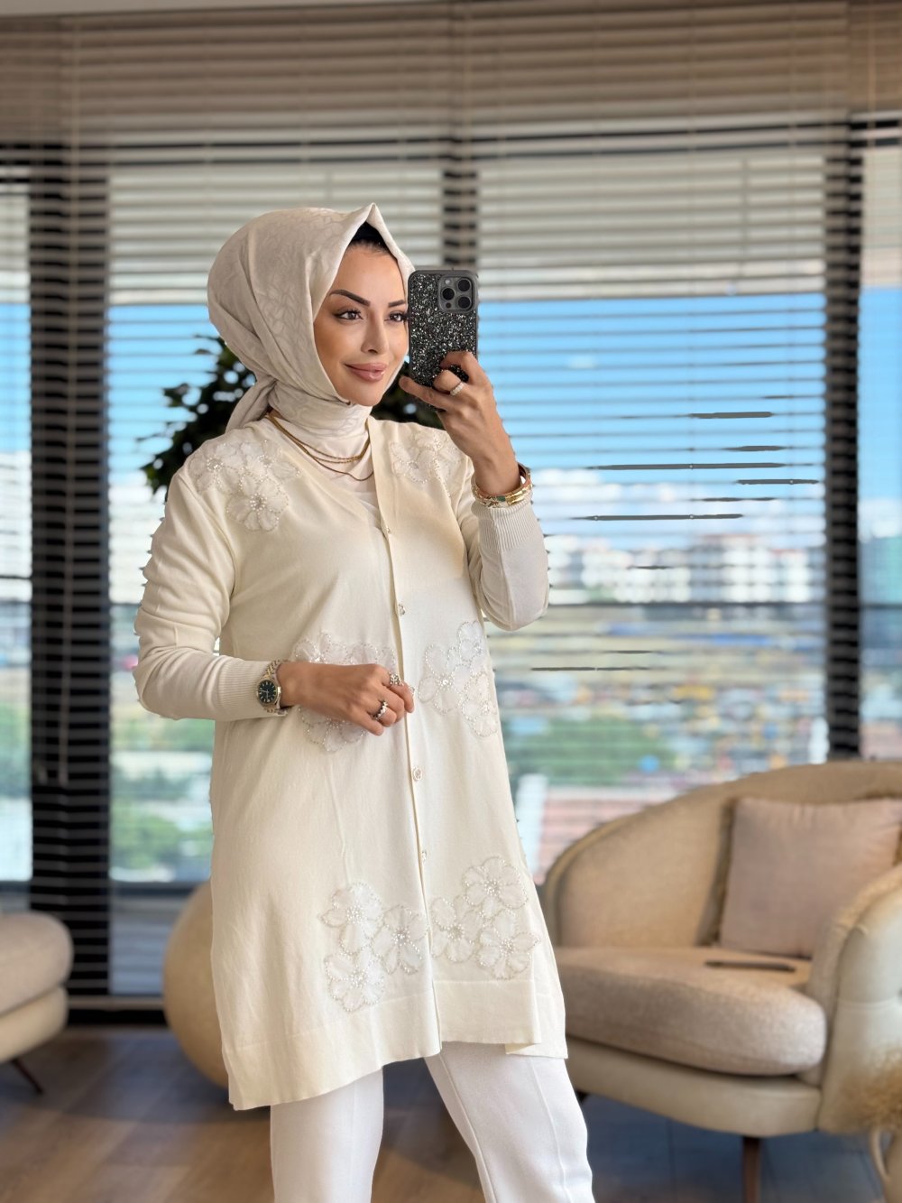 145111 Üçlü Çiçekli Uzun Hırka Ekru