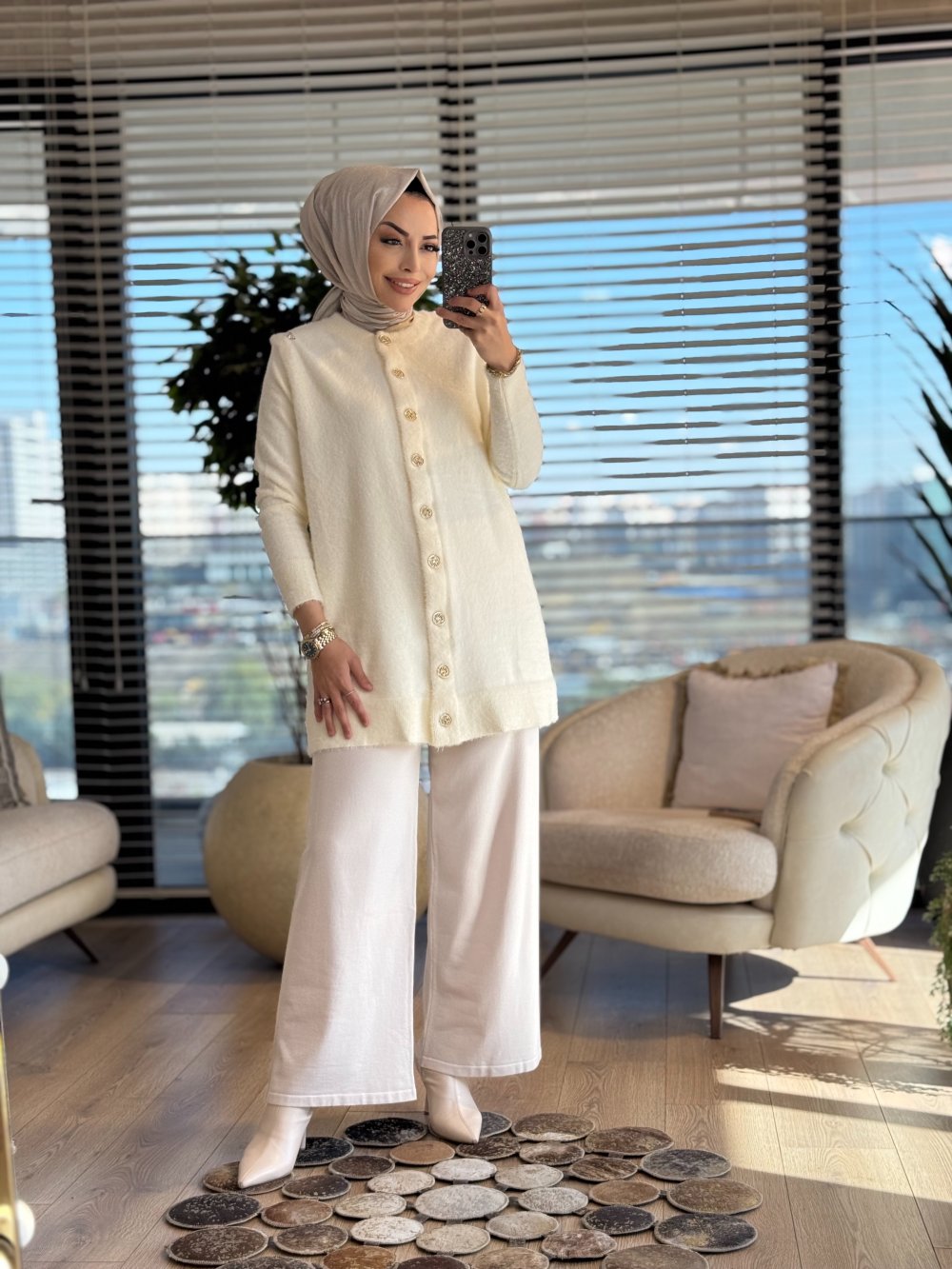 145402 Angora Omuzu Şık Taşlı Hırka Ekru