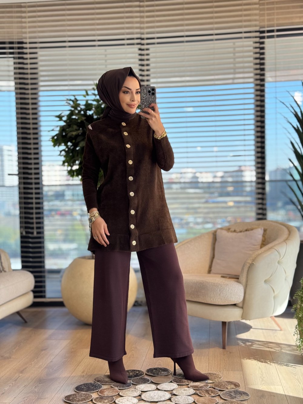 145402 Angora Omuzu Şık Taşlı Hırka Kahve