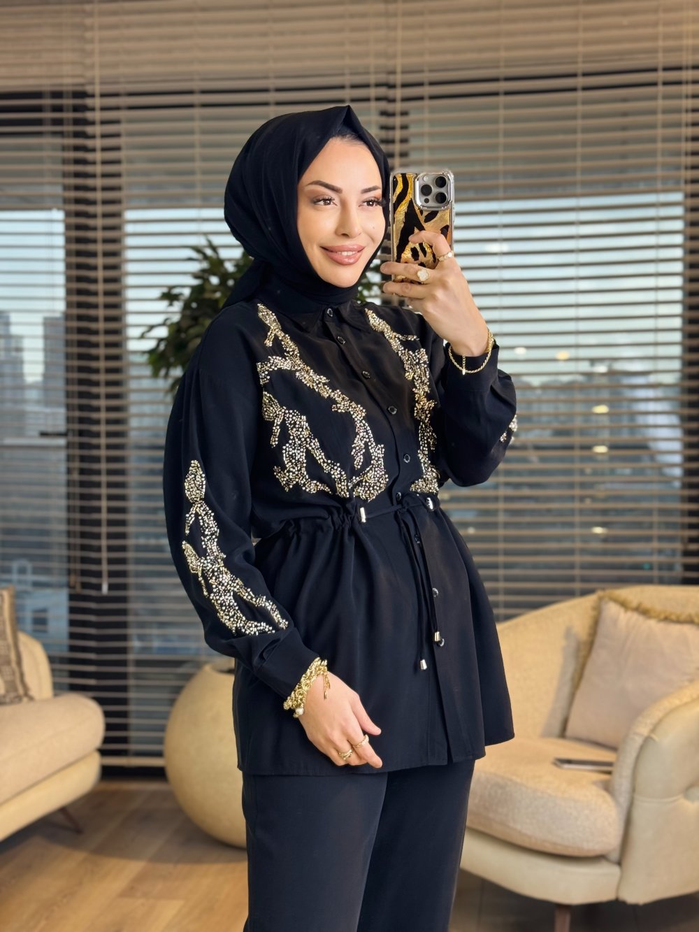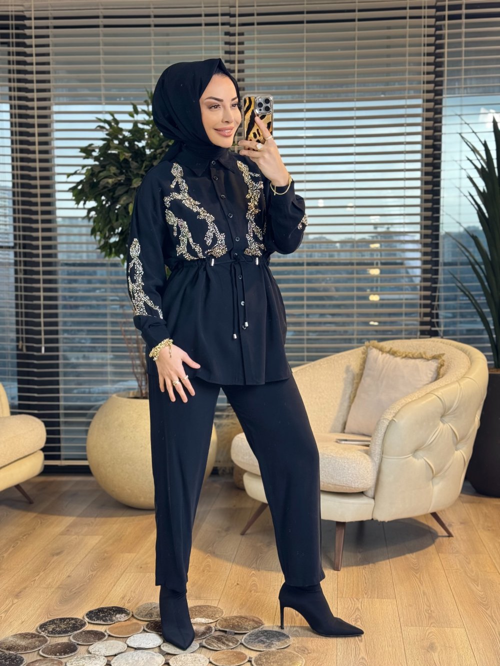 1490 Ön Kolu Boncuk İşlemeli Takım Siyah
