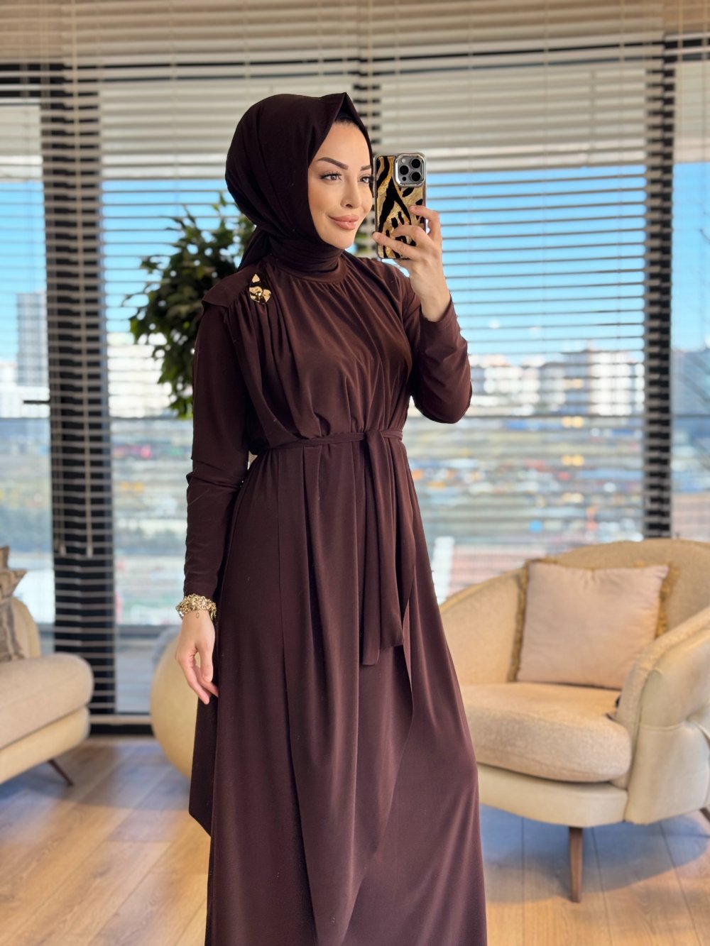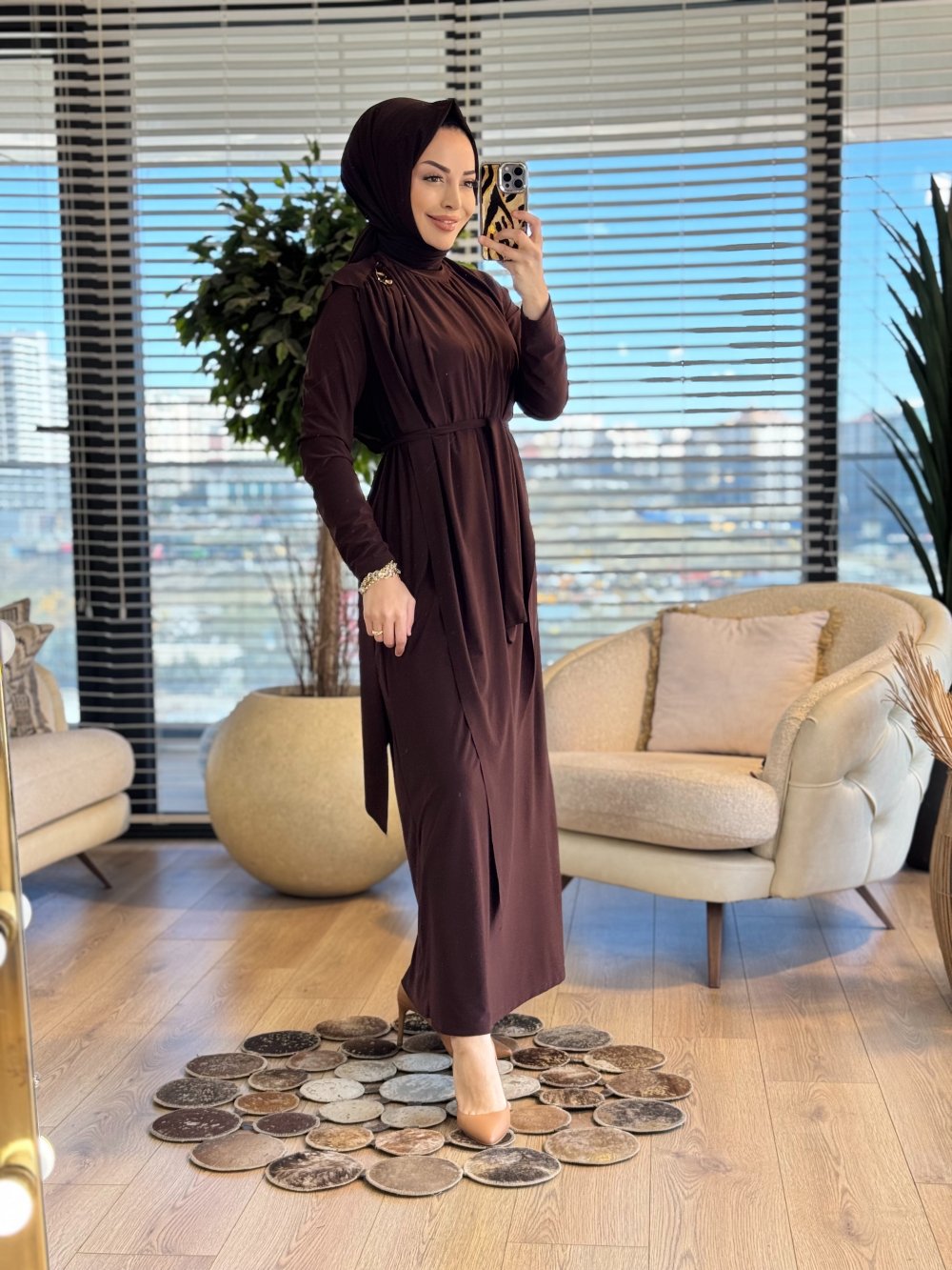 1513 Üstleri Üçgen Pelerinli Elbise Kahve