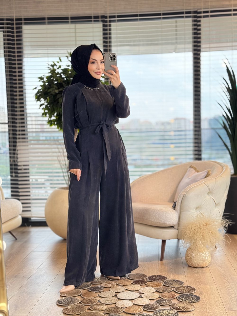 17-1016 Yakası Taş İşlemeli Tulum Siyah