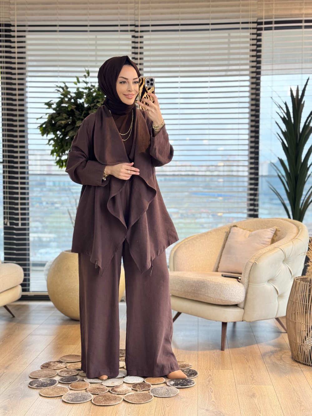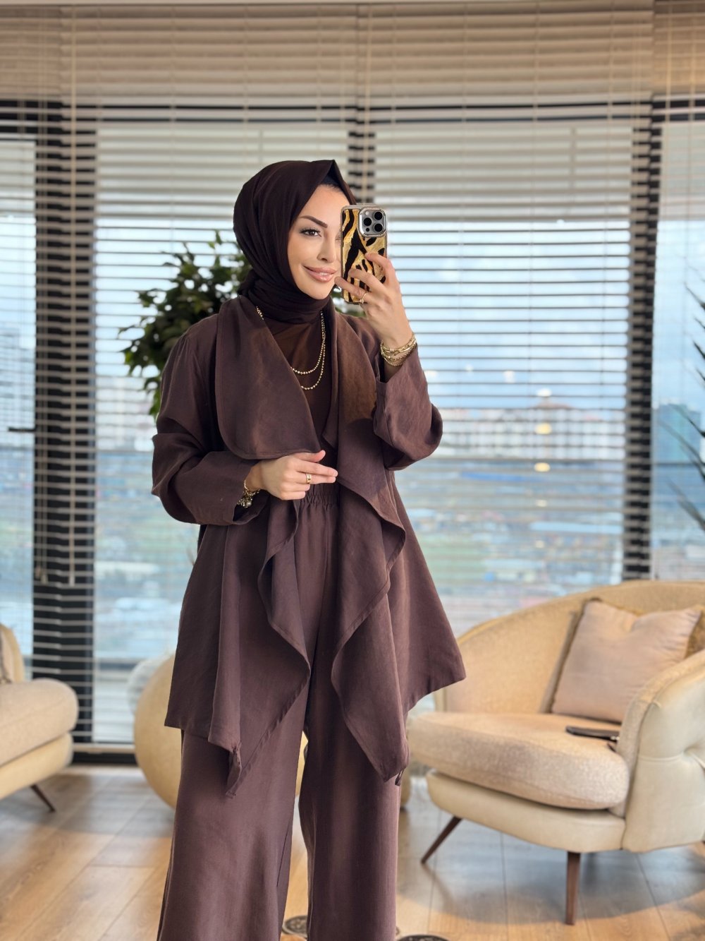 19267 Şal Yaka Büyük Beden Takım Kahve