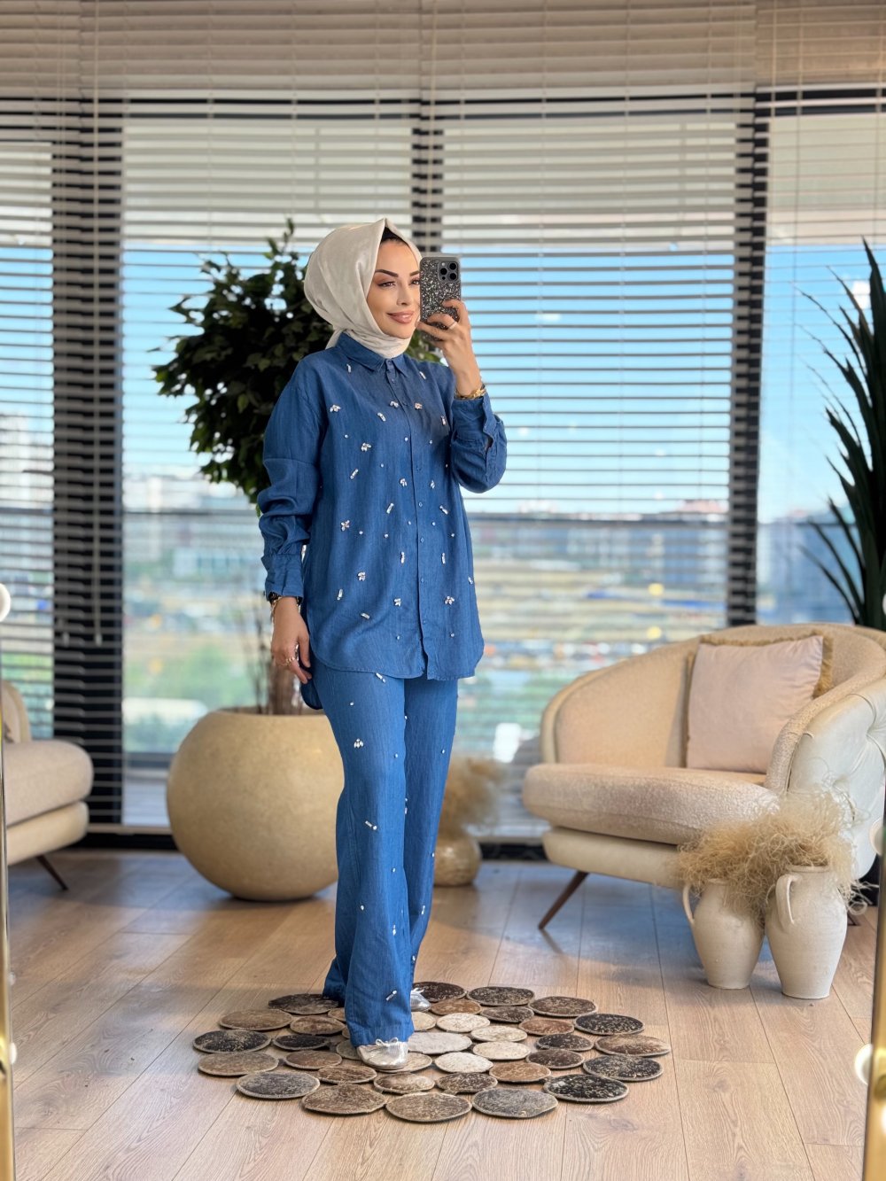 2018 Tencel Önü Taş İşlemeli Gömlek Mavi