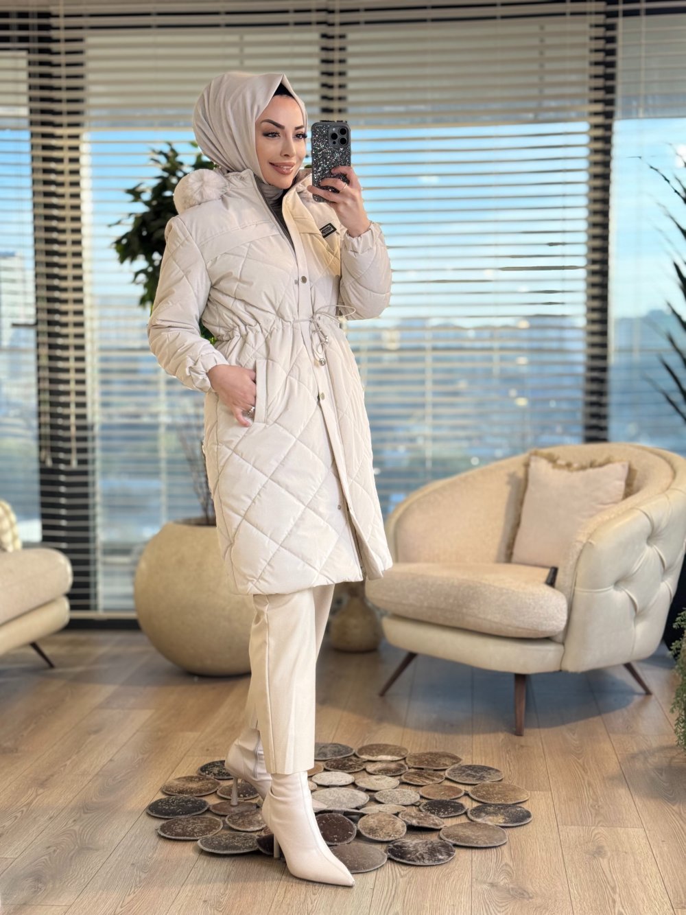 2024 Kapitone Kapş.Kürk Uzun Kaban Bej