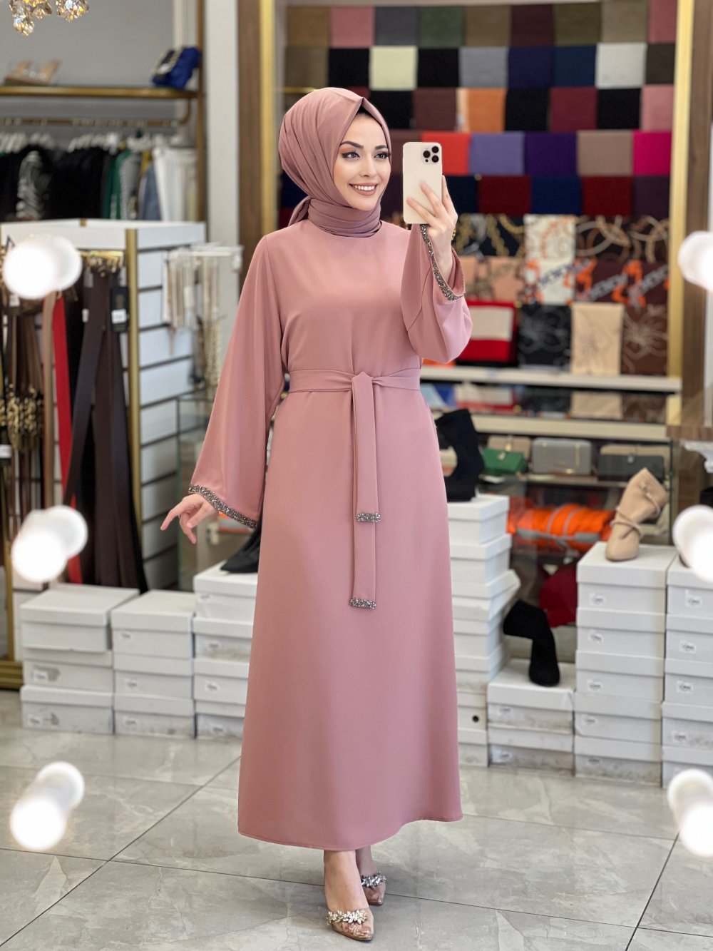 1412 Şifon Zikzak Desenli Patı Taşlı Elbise Yağ Yeşili