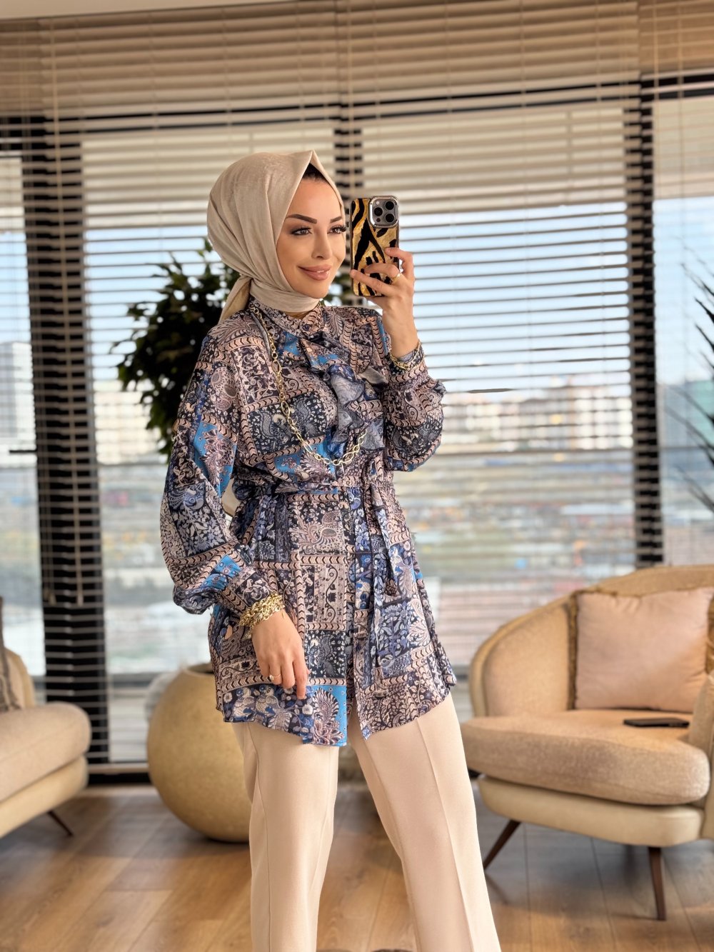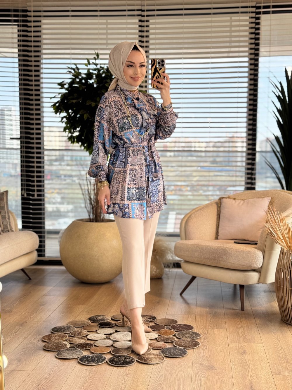 2033-1 Kumsal Pano Desen Tunik Lacivert