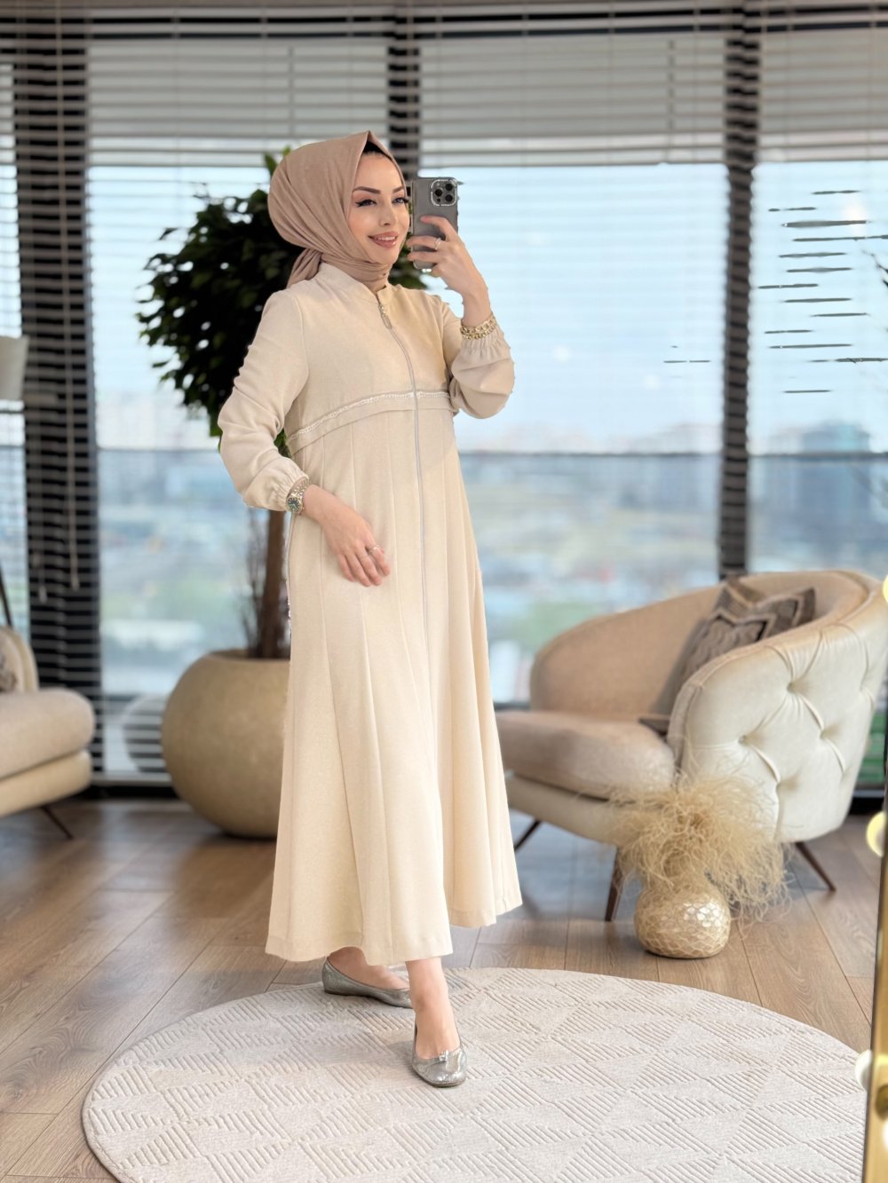 2040 Ön Ve Arkası Su Taş Detaylı Kap Ekru
