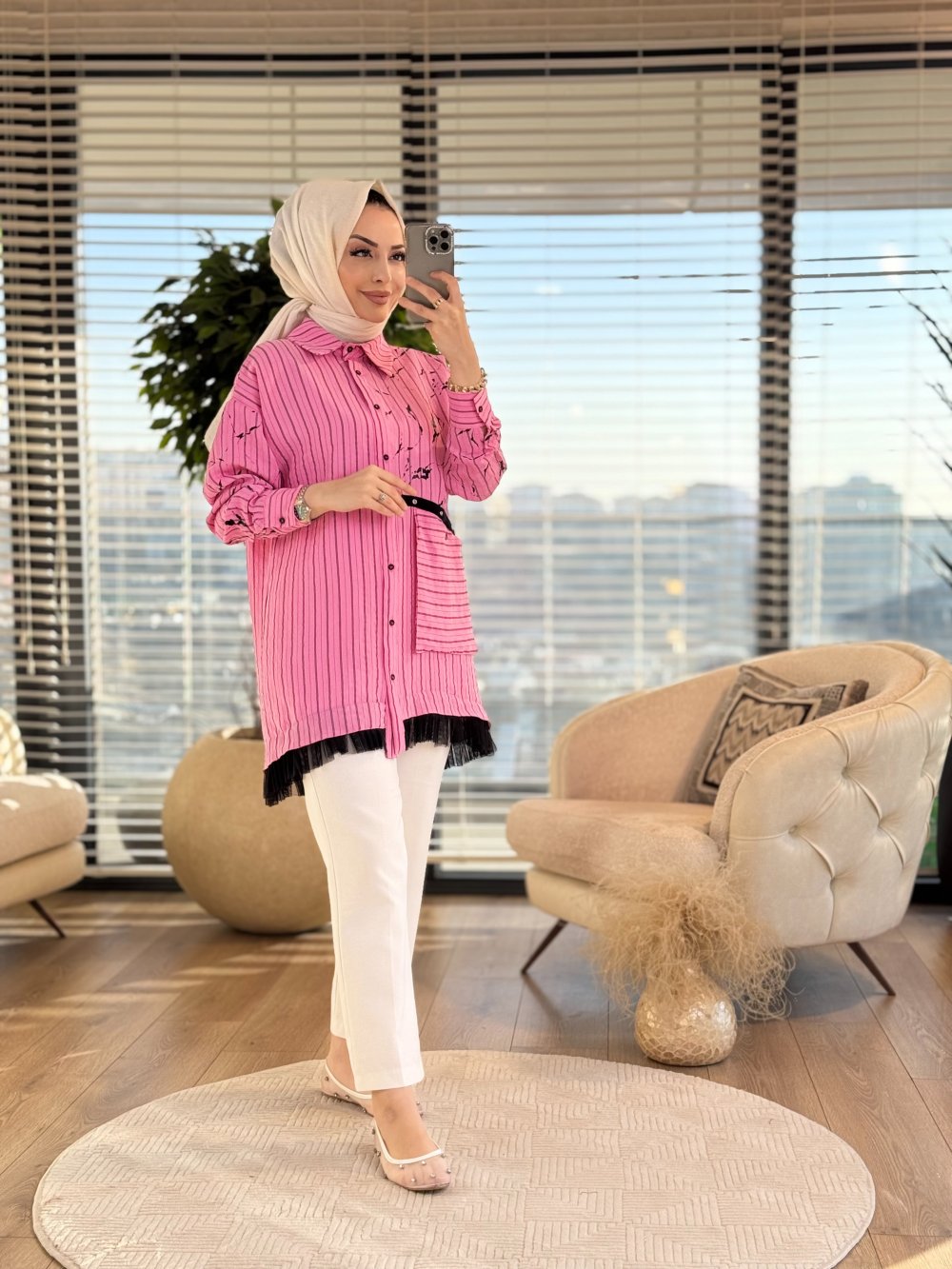 2051 Çizgili Etek Ucu Tüllü Gömlek Fuşya