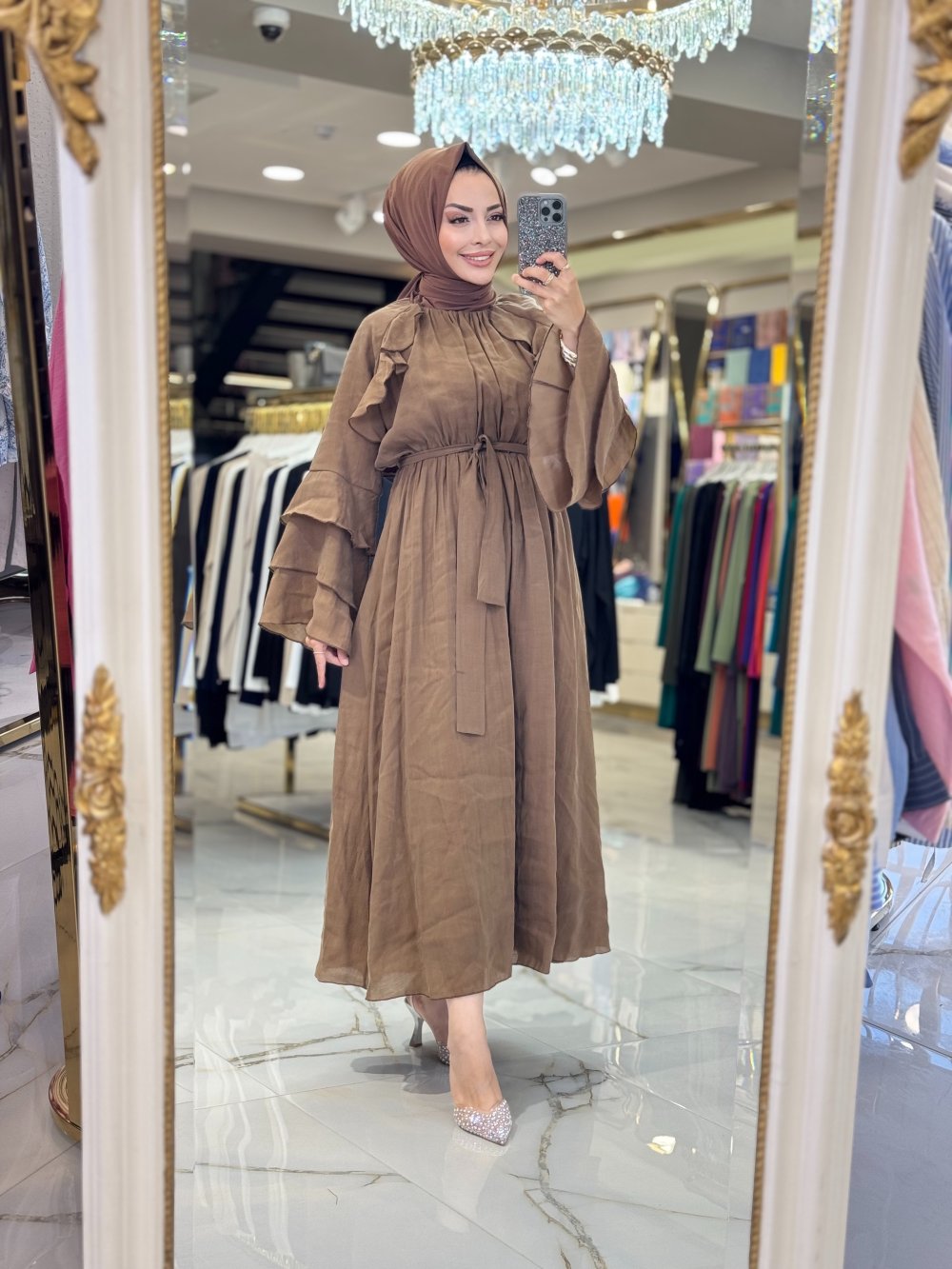 20717 Ön Kol Fırfırlı Elbise Kahve