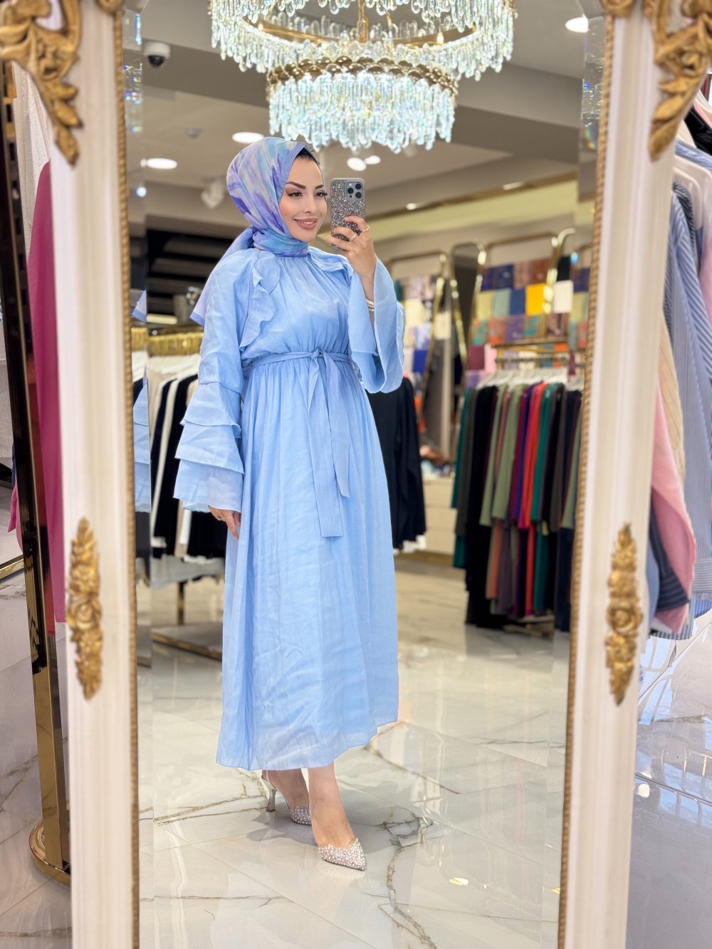 20717 Ön Kol Fırfırlı Elbise Mavi