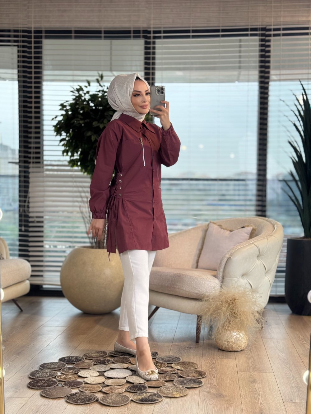 2086 Yanları Bağcıklı Uzun Gömlek Bordo