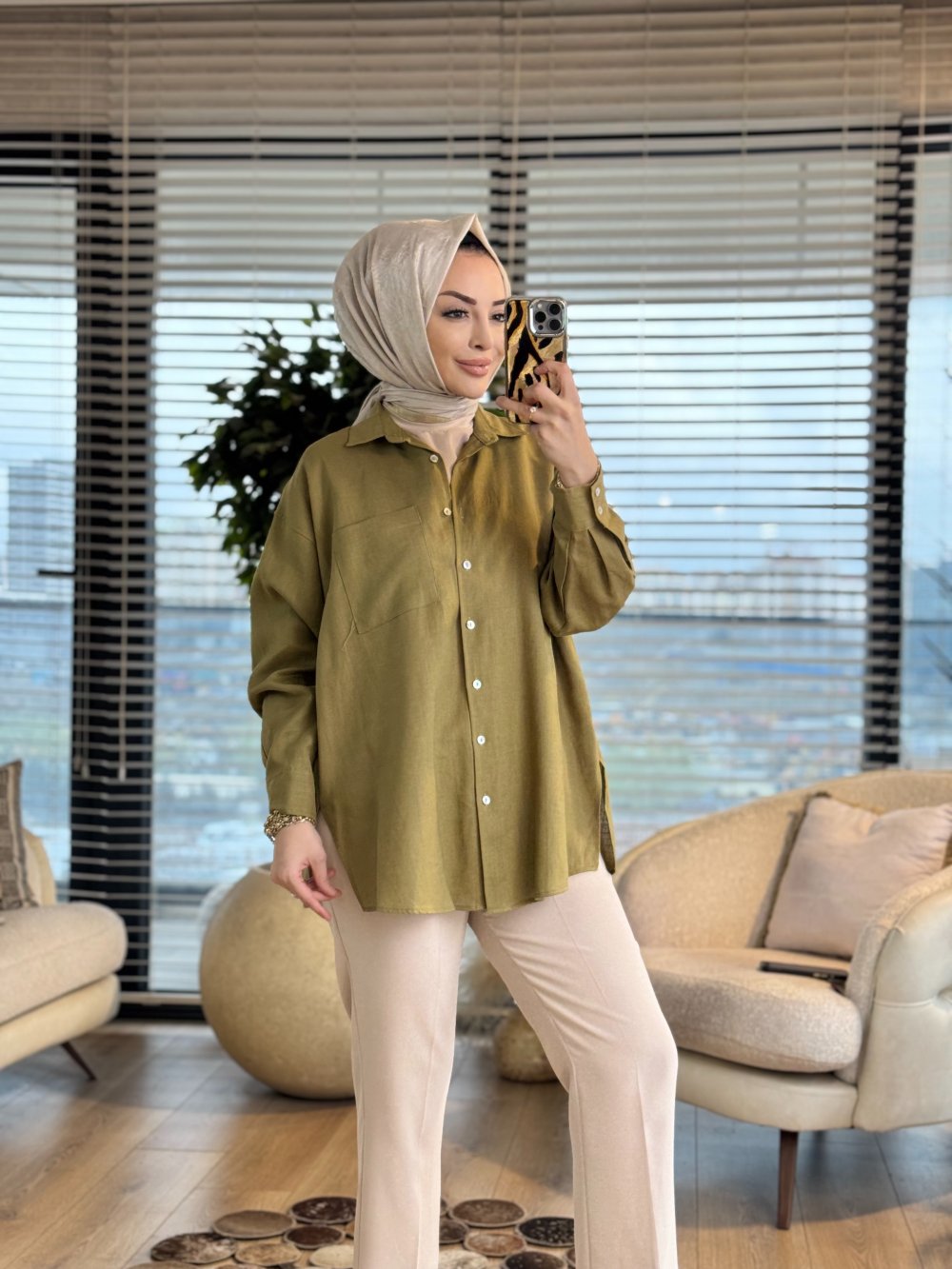 2126 Mess Keten Gömlek Yağ Yeşili