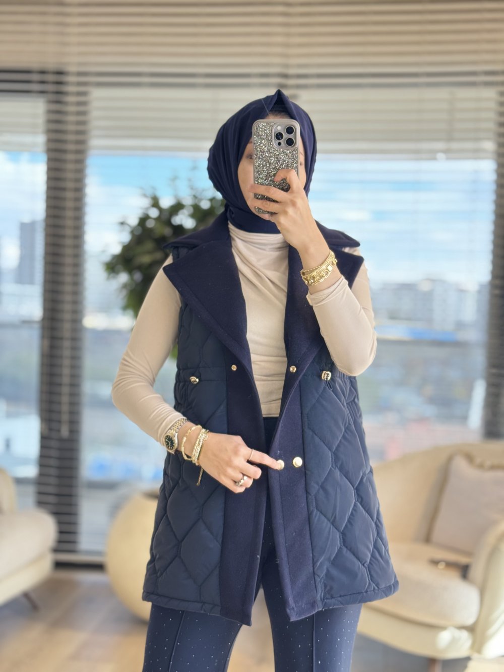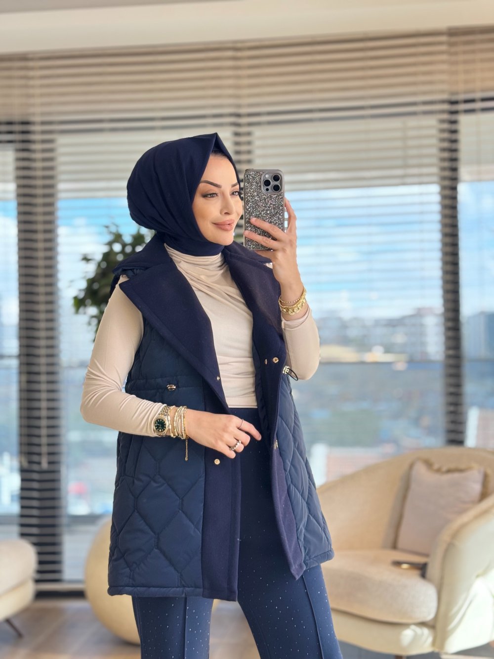 2190 Kapitone Kaşe Detaylı Yelek Lacivert