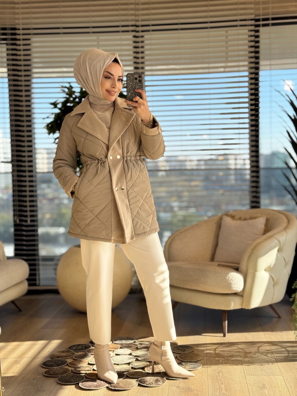 2208 Kapitone Kaşe Garnili Kaban Bej