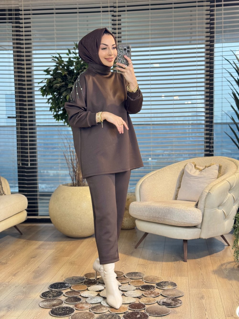 22159 Omuzları Taş İşlemeli Takım Kahve