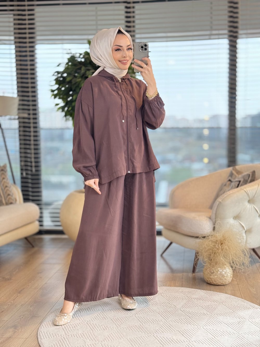 22683 Kapşonlu Ön Fermuarlı Takım Kahve