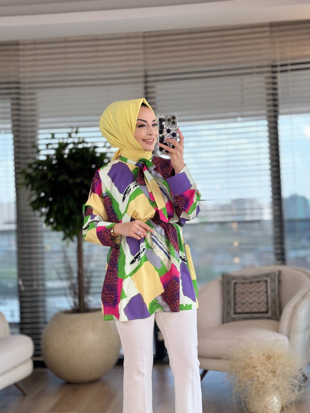 23071 Desenli Yaka Bağcıklı Tunik Saks