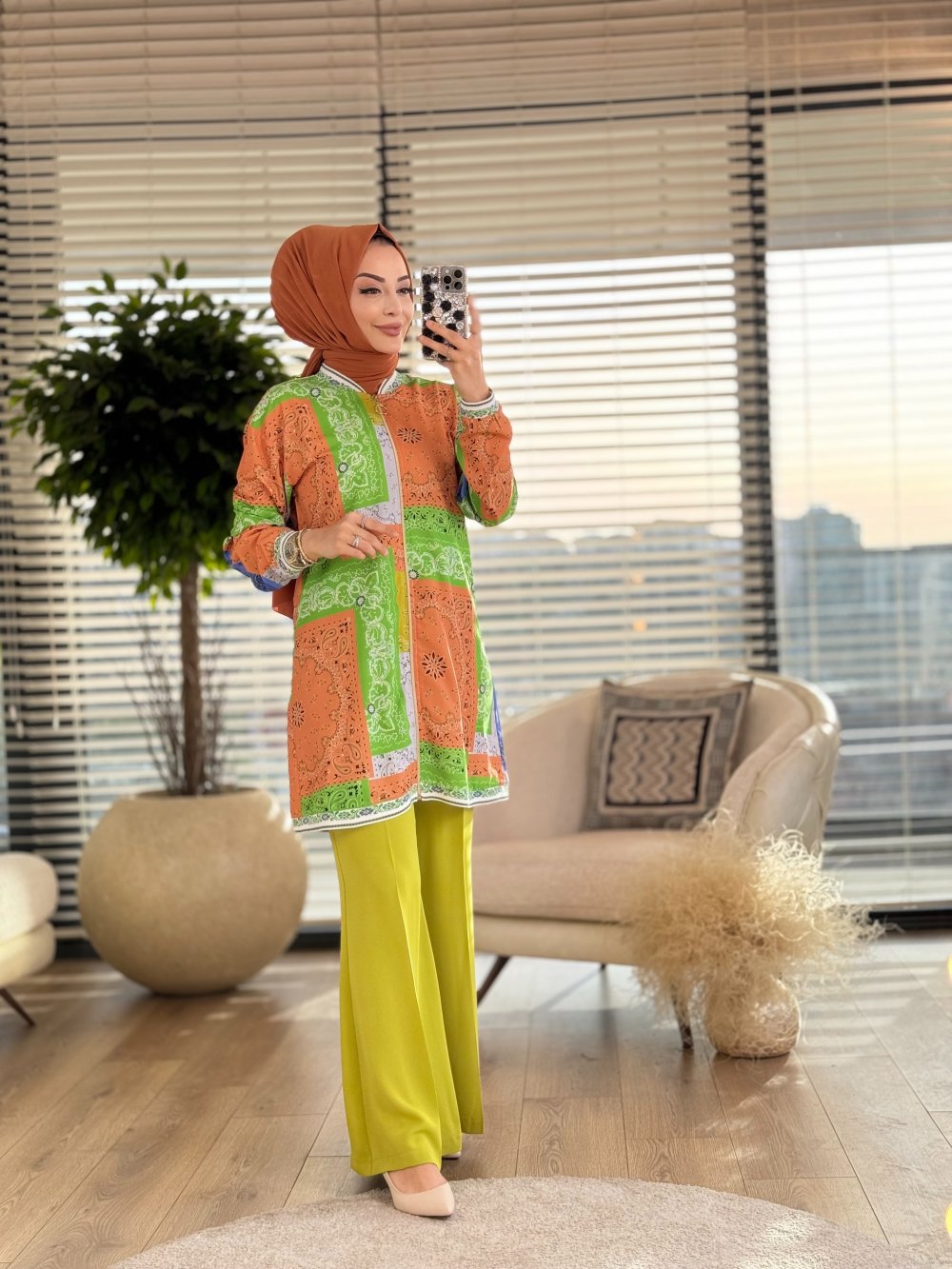 23072 Pano Desen Fermuarlı Hırka Yeşil