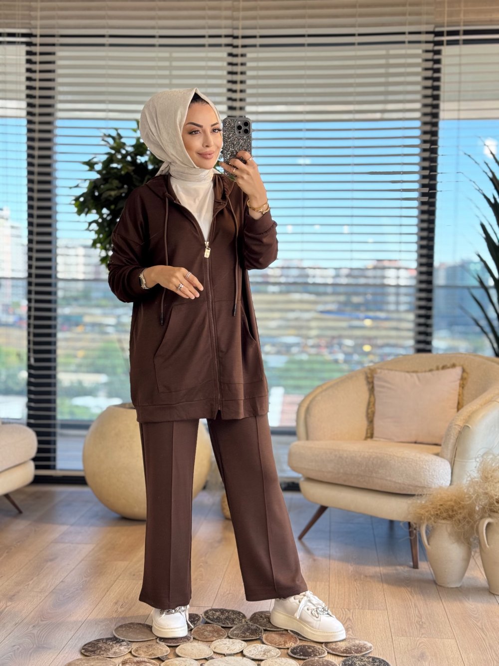 2319 Kapşonlu Önü Fermuarlı Takım Kahve