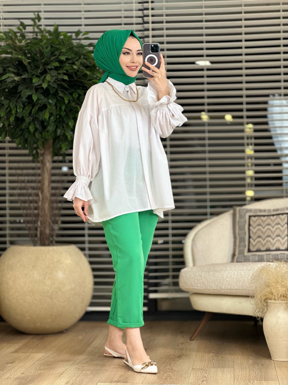 2358 Kolu Büzgülü Gömlek Beyaz