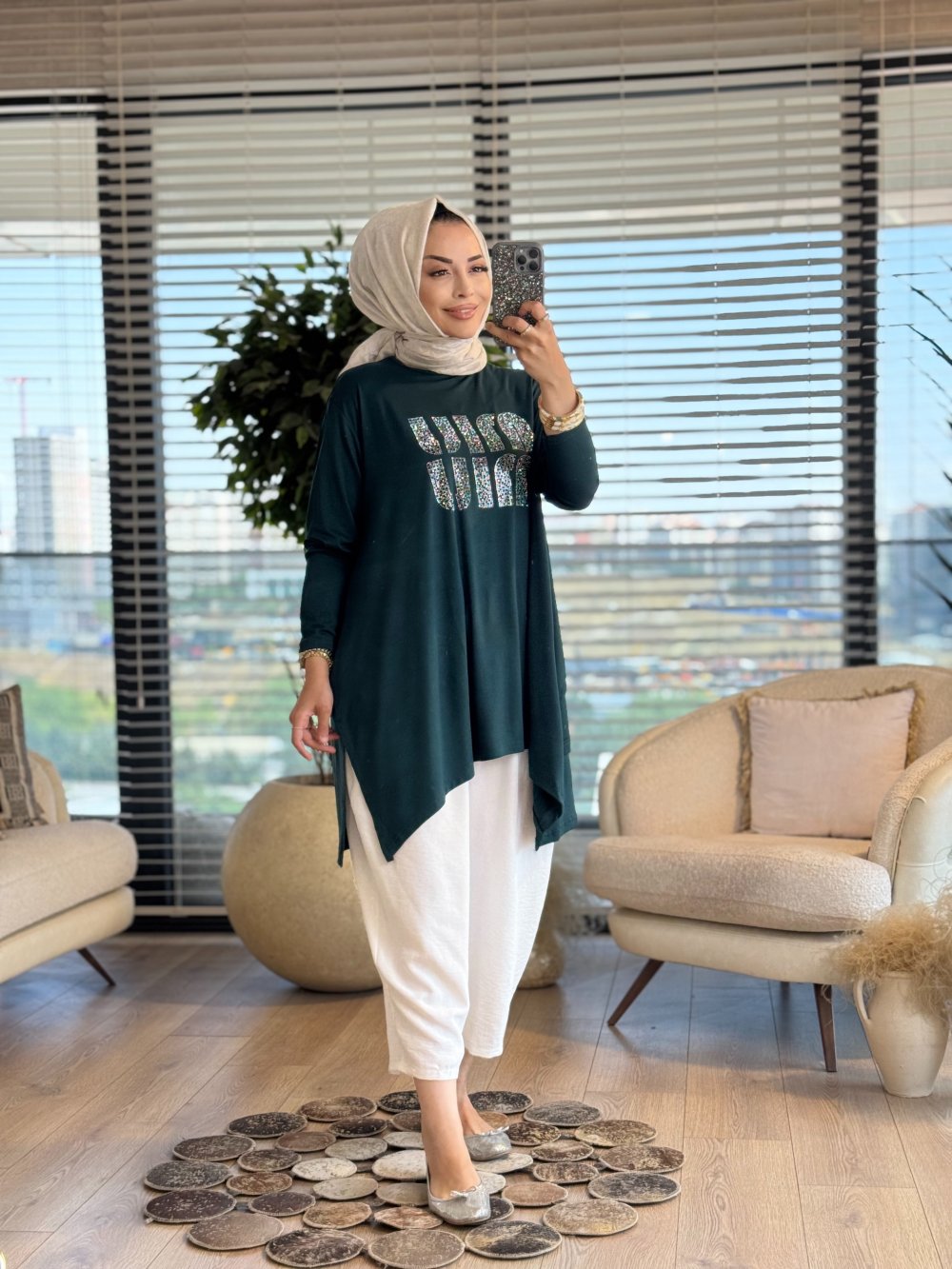 24277 Önü Taş Yazılı Tunik Zümrüt