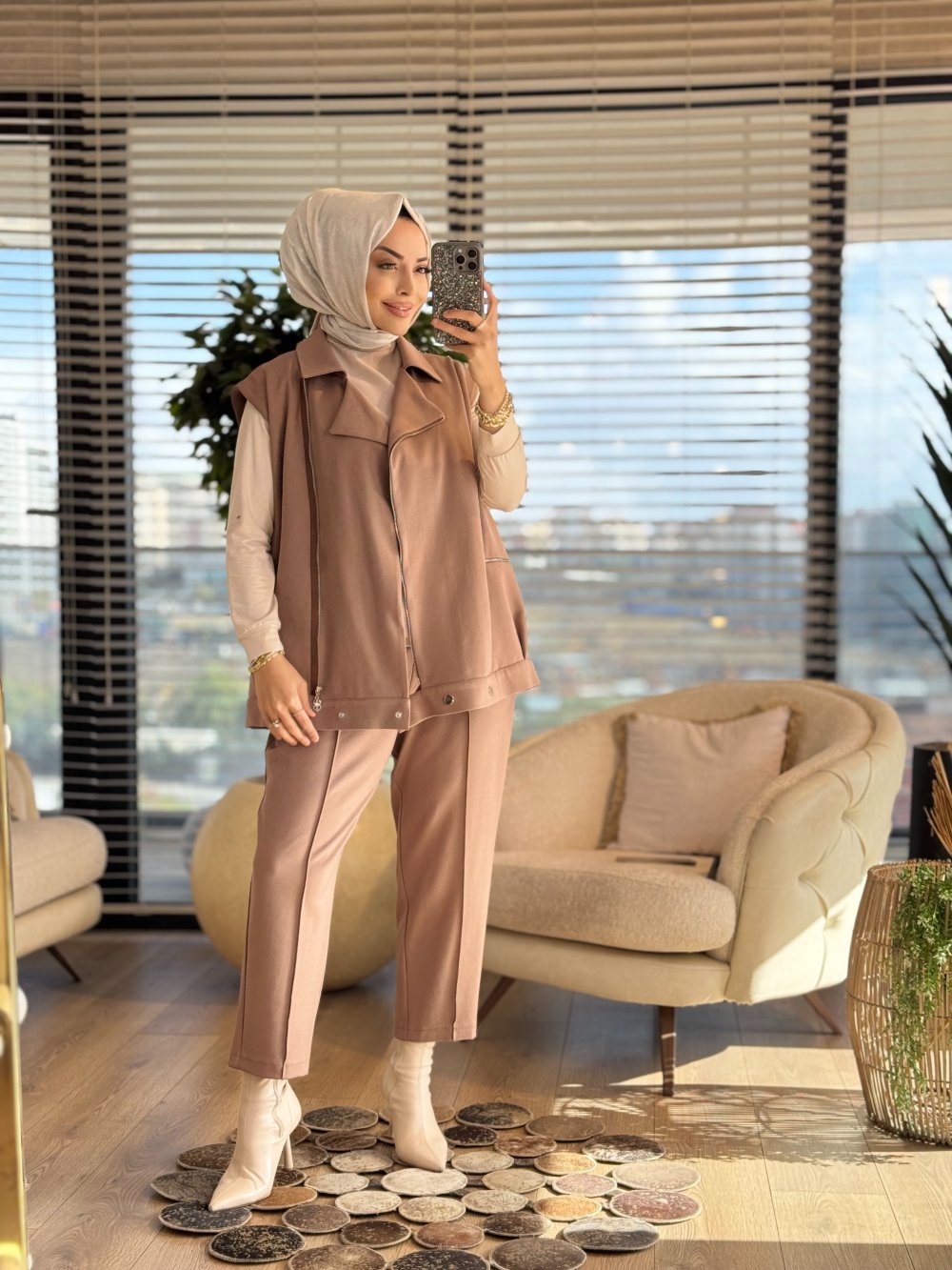 2428 Üst Yelekli Fermuarlı Takım Latte