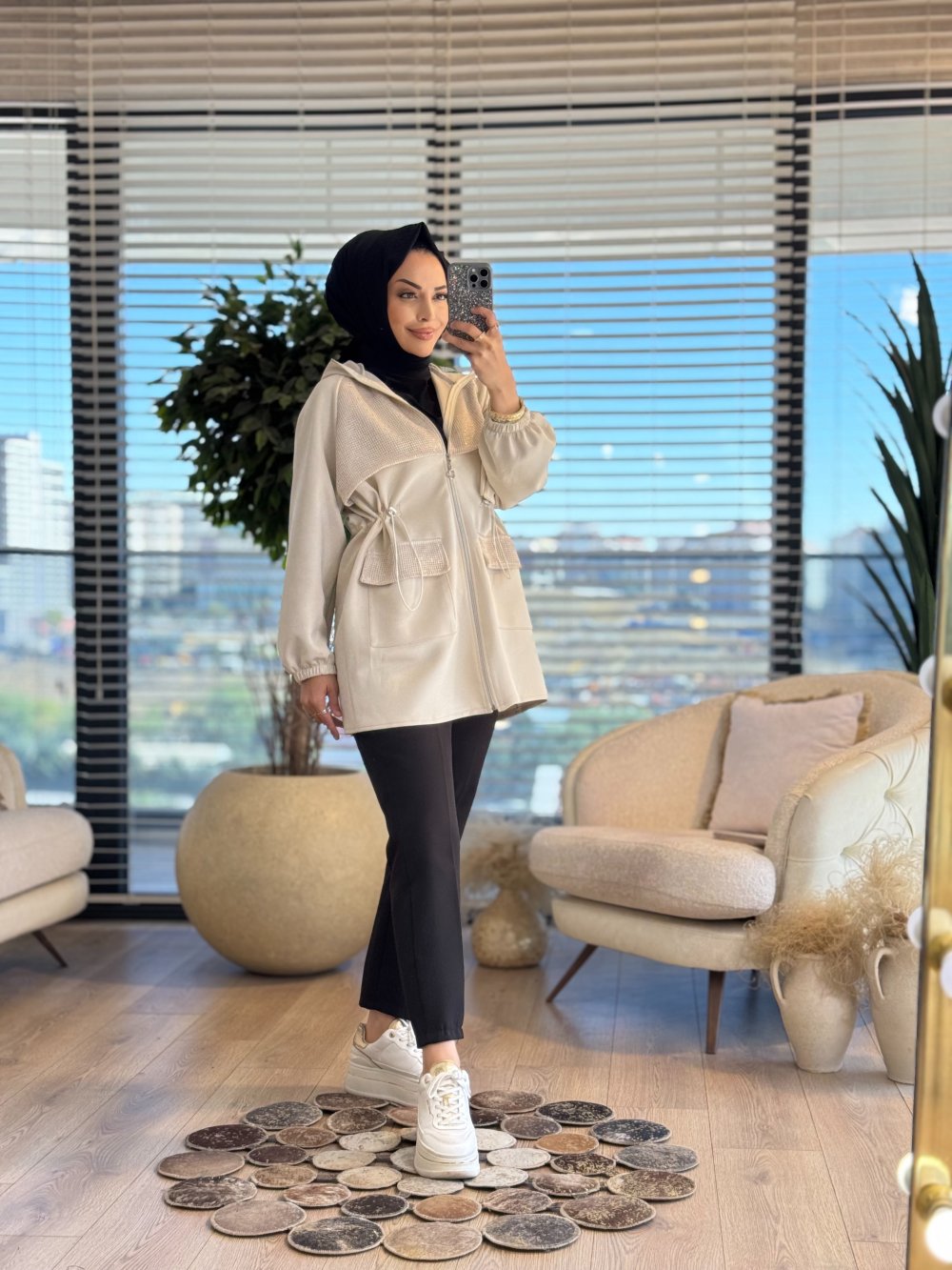 24339 Ön File Parçalı Kapşonlu Kap Bej